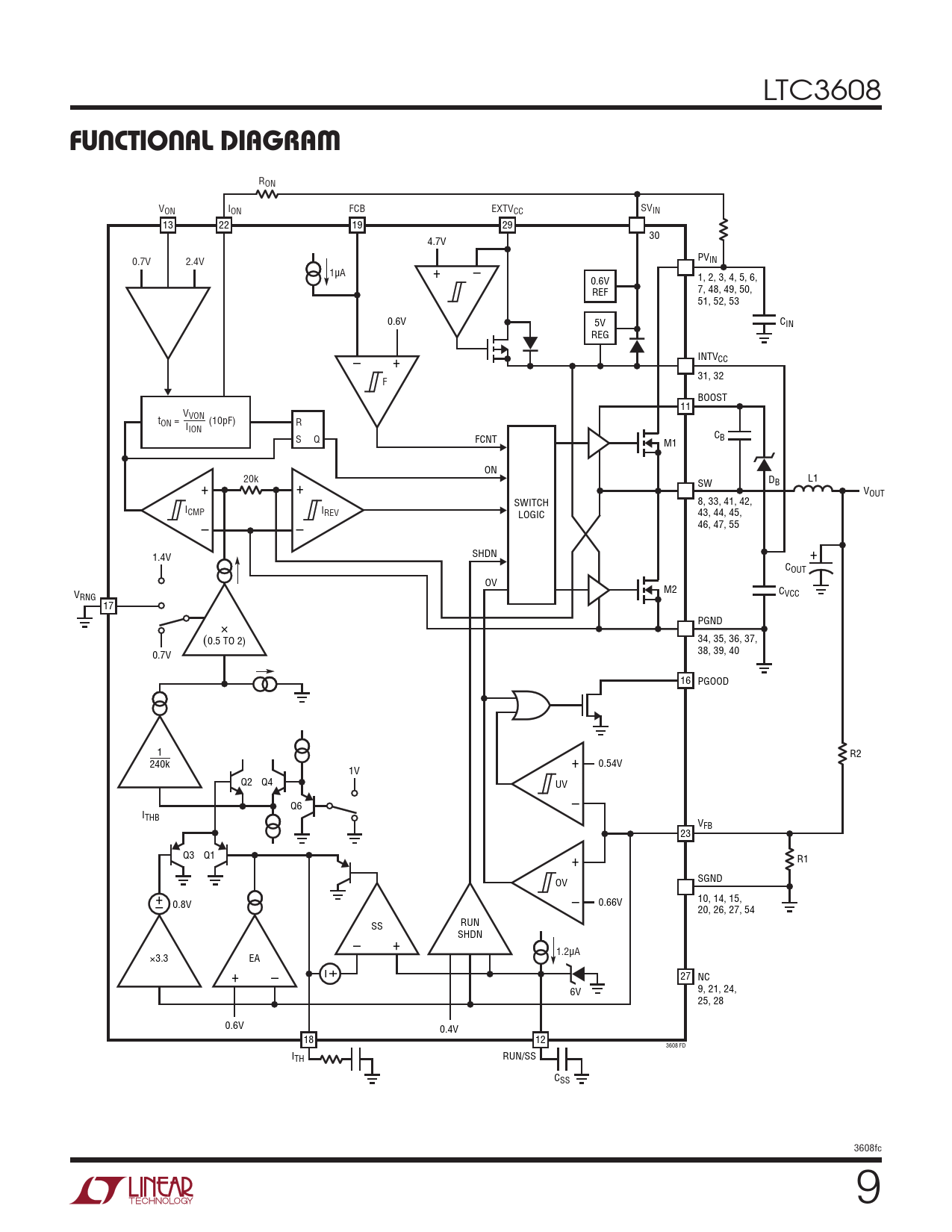 LTC3608. Functional. DiagraM. RON. VON. ION. FCB. EXTVCC. SVIN. 13. 22. 19. 29. 4.7V. 30. 0.7V. PV. 2.4V. IN. 1µA. +. –. 0.6V. 1,. 2,. 3,. 4,. 5,. 6,. REF. 7,. 48,. 49,. 50,. 51,. 52,. 53. 0.6V