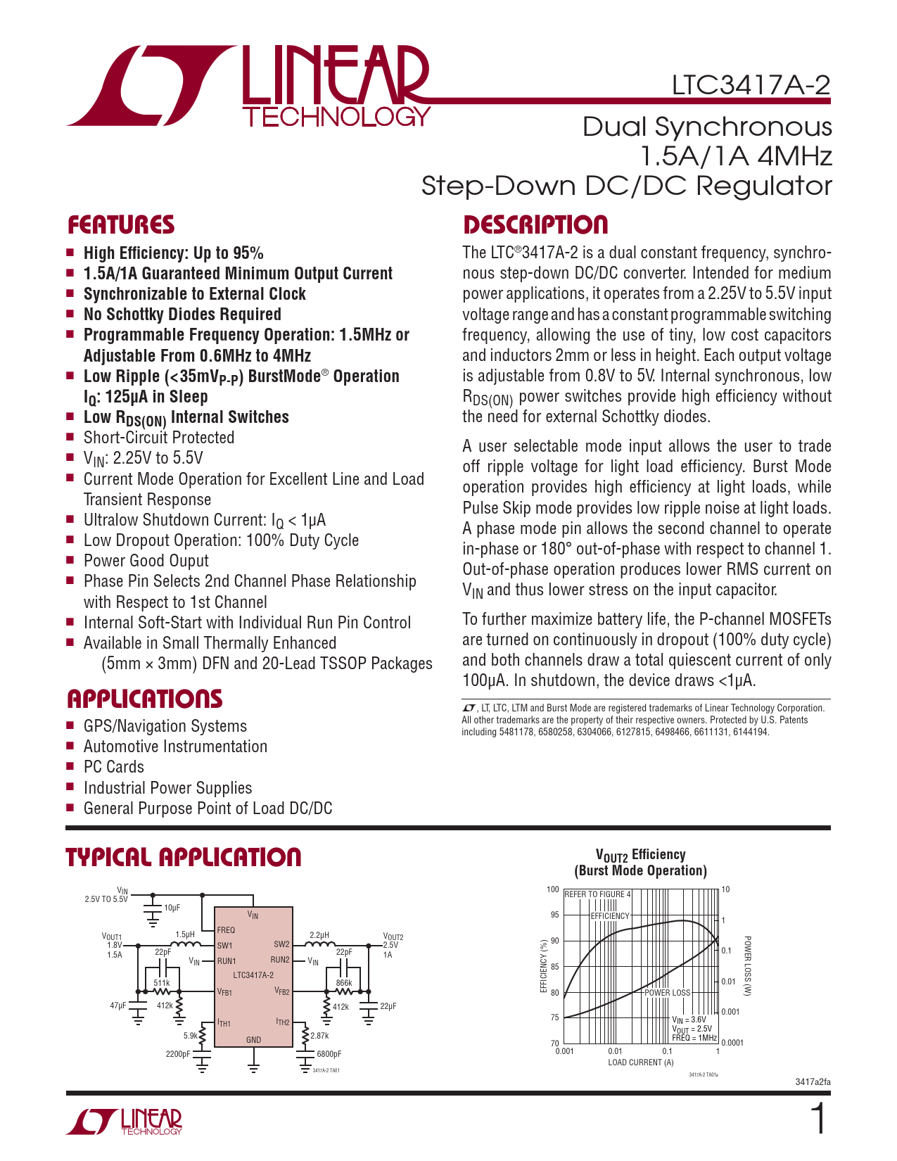 LTC3417A-2 Dual Synchronous 1.5A/1A 4MHz Step-Down DC/DC Regulator FEATURESDESCRIPTION n High Effi ciency: Up to 95% The LTC®3417A-2 is a dual constant frequency, synchro- n 1.5A/1A Guaranteed Minimum Output Current nous step-down DC/DC converter. Intended for medium n Synchronizable to External Clock power applications, it operates from a 2.25V to 5.5V input n No Schottky Diodes Required voltage range and has a constant programmable switching n Programmable Frequency Operation: 1.5MHz or frequency, allowing the use of tiny, low cost capacitors Adjustable From 0.6MHz to 4MHz and inductors 2mm or less in height. Each output voltage n Low Ripple (<35mV is adjustable from 0.8V to 5V. Internal synchronous, low P-P) BurstMode ® OperationI R Q: 125μA in Sleep DS(ON) power switches provide high effi ciency without n Low R the need for external Schottky diodes. DS(ON) Internal Switches n Short-Circuit Protected A user selectable mode input allows the user to trade n VIN: 2.25V to 5.5V off ripple voltage for light load effi ciency. Burst Mode n Current Mode Operation for Excellent Line and Load operation provides high effi ciency at light loads, while Transient Response Pulse Skip mode provides low ripple noise at light loads. n Ultralow Shutdown Current: IQ < 1μA A phase mode pin allows the second channel to operate n Low Dropout Operation: 100% Duty Cycle in-phase or 180° out-of-phase with respect to channel 1. n Power Good Ouput Out-of-phase operation produces lower RMS current on n Phase Pin Selects 2nd Channel Phase Relationship VIN and thus lower stress on the input capacitor. with Respect to 1st Channel n Internal Soft-Start with Individual Run Pin Control To further maximize battery life, the P-channel MOSFETs n Available in Small Thermally Enhanced are turned on continuously in dropout (100% duty cycle) (5mm × 3mm) DFN and 20-Lead TSSOP Packages and both channels draw a total quiescent current of only 100μA. In shutdown, the device draws <1μA. APPLICATIONS L, LT, LTC, LTM and Burst Mode are registered trademarks of Linear Technology Corporation. n GPS/Navigation Systems All other trademarks are the property of their respective owners. Protected by U.S. Patents including 5481178, 6580258, 6304066, 6127815, 6498466, 6611131, 6144194. n Automotive Instrumentation n PC Cards n Industrial Power Supplies n General Purpose Point of Load DC/DC VOUT2 Effi ciencyTYPICAL APPLICATION(Burst Mode Operation) VIN 100 10 REFER TO FIGURE 4 2.5V TO 5.5V 10μF VIN 95 EFFICIENCY 1 FREQ V 1.5μH 2.2μH POWER LOSS (W) OUT1 VOUT2 90 1.8V SW1 SW2 2.5V 22pF 22pF 1.5A 1A 0.1 VIN RUN1 RUN2 VIN 85 LTC3417A-2 511k 866k 0.01 V EFFICIENCY (%) FB1 VFB2 80 POWER LOSS 47μF 412k 412k 22μF 0.001 75 I V TH1 ITH2 IN = 3.6V VOUT = 2.5V 5.9k 2.87k GND FREQ = 1MHz 70 0.0001 2200pF 6800pF 0.001 0.01 0.1 1 LOAD CURRENT (A) 3417A-2 TA01 3417A-2 TA01a 3417a2fa 1