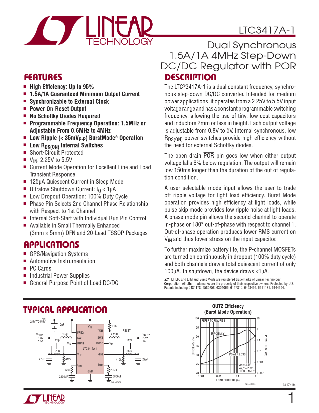 LTC3417A-1 Dual Synchronous 1.5A/1A 4MHz Step-Down DC/DC Regulator with POR FEATURESDESCRIPTION n High Effi ciency: Up to 95% The LTC®3417A-1 is a dual constant frequency, synchro- n 1.5A/1A Guaranteed Minimum Output Current nous step-down DC/DC converter. Intended for medium n Synchronizable to External Clock power applications, it operates from a 2.25V to 5.5V input n Power-On-Reset Output voltage range and has a constant programmable switching n No Schottky Diodes Required frequency, allowing the use of tiny, low cost capacitors n Programmable Frequency Operation: 1.5MHz or and inductors 2mm or less in height. Each output voltage Adjustable From 0.6MHz to 4MHz is adjustable from 0.8V to 5V. Internal synchronous, low n Low Ripple (< 35mV R P-P) BurstMode ® Operation DS(ON) power switches provide high effi ciency without n Low R the need for external Schottky diodes. DS(ON) Internal Switches n Short-Circuit Protected The open drain POR pin goes low when either output n VIN: 2.25V to 5.5V voltage falls 6% below regulation. The output will remain n Current Mode Operation for Excellent Line and Load low 150ms longer than the duration of the out of regula- Transient Response tion condition. n 125μA Quiescent Current in Sleep Mode n Ultralow Shutdown Current: I A user selectable mode input allows the user to trade Q < 1μA n Low Dropout Operation: 100% Duty Cycle off ripple voltage for light load effi ciency. Burst Mode n Phase Pin Selects 2nd Channel Phase Relationship operation provides high effi ciency at light loads, while with Respect to 1st Channel pulse skip mode provides low ripple noise at light loads. n Internal Soft-Start with Individual Run Pin Control A phase mode pin allows the second channel to operate n Available in Small Thermally Enhanced in-phase or 180° out-of-phase with respect to channel 1. (3mm × 5mm) DFN and 20-Lead TSSOP Packages Out-of-phase operation produces lower RMS current on VIN and thus lower stress on the input capacitor. APPLICATIONS To further maximize battery life, the P-channel MOSFETs n GPS/Navigation Systems are turned on continuously in dropout (100% duty cycle) n Automotive Instrumentation and both channels draw a total quiescent current of only n PC Cards 100μA. In shutdown, the device draws <1μA. n Industrial Power Supplies L, LT, LTC and LTM and Burst Mode are registered trademarks of Linear Technology n General Purpose Point of Load DC/DC Corporation. All other trademarks are the property of their respective owners. Protected by U.S. Patents including 5481178, 6580258, 6304066, 6127815, 6498466, 6611131, 6144194. OUT2 Effi ciencyTYPICAL APPLICATION(Burst Mode Operation) VIN 100 10 2.5V TO 5.5V REFER TO FIGURE 4 10μF V 100k IN 95 POR RESET 1 FREQ V 1.5μH 2.2μH EFFICIENCY OUT1 VOUT2 POWER LOSS (W) 1.8V SW1 SW2 2.5V 90 22pF 22pF 1.5A 1A 0.1 VIN RUN1 RUN2 VIN 85 LTC3417A-1 511k 866k 0.01 VFB1 VFB2 EFFICIENCY (%) 80 POWER LOSS 47μF 412k 412k 22μF 0.001 I 75 V TH1 ITH2 IN = 3.6V V 5.9k 2.87k OUT = 2.5V GND FREQ = 1MHz 70 0.0001 2200pF 6800pF 0.001 0.01 0.1 1 LOAD CURRENT (A) 3417A-1 TA01 3417A-1 TA01a 3417a1fa 1
