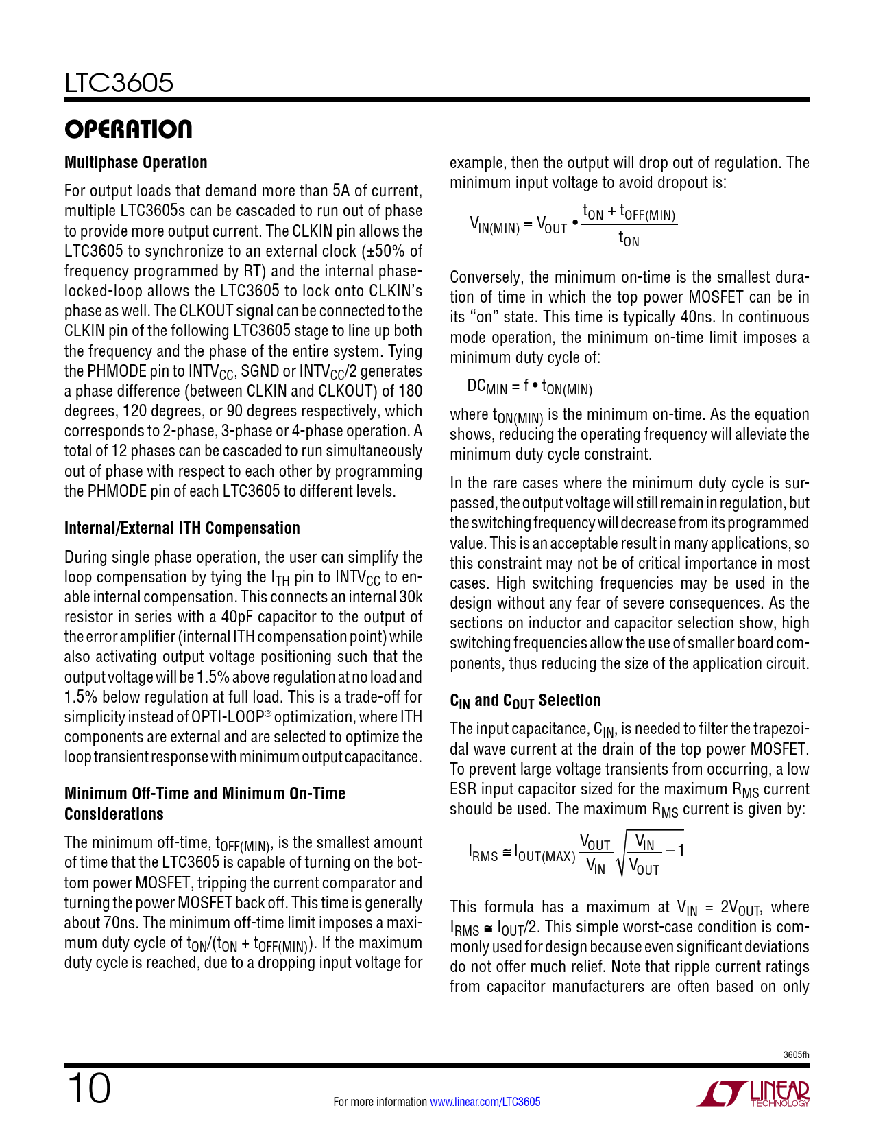 LTC3605 operaTion Multiphase Operation example, then the output will drop out of regulation. The For output loads that demand more than 5A of current, minimum input voltage to avoid dropout is: multiple LTC3605s can be cascaded to run out of phase tON + tOFF(MIN) to provide more output current. The CLKIN pin allows the VIN(MIN) = VOUT • t LTC3605 to synchronize to an external clock (±50% of ON frequency programmed by RT) and the internal phase- Conversely, the minimum on-time is the smallest dura- locked-loop allows the LTC3605 to lock onto CLKIN’s tion of time in which the top power MOSFET can be in phase as well. The CLKOUT signal can be connected to the its “on” state. This time is typically 40ns. In continuous CLKIN pin of the following LTC3605 stage to line up both mode operation, the minimum on-time limit imposes a the frequency and the phase of the entire system. Tying minimum duty cycle of: the PHMODE pin to INTVCC, SGND or INTVCC/2 generates a phase difference (between CLKIN and CLKOUT) of 180 DCMIN = f • tON(MIN) degrees, 120 degrees, or 90 degrees respectively, which where tON(MIN) is the minimum on-time. As the equation corresponds to 2-phase, 3-phase or 4-phase operation. A shows, reducing the operating frequency will alleviate the total of 12 phases can be cascaded to run simultaneously minimum duty cycle constraint. out of phase with respect to each other by programming the PHMODE pin of each LTC3605 to different levels. In the rare cases where the minimum duty cycle is sur- passed, the output voltage will still remain in regulation, but Internal/External ITH Compensation the switching frequency will decrease from its programmed value. This is an acceptable result in many applications, so During single phase operation, the user can simplify the this constraint may not be of critical importance in most loop compensation by tying the ITH pin to INTVCC to en- cases. High switching frequencies may be used in the able internal compensation. This connects an internal 30k design without any fear of severe consequences. As the resistor in series with a 40pF capacitor to the output of sections on inductor and capacitor selection show, high the error amplifier (internal ITH compensation point) while switching frequencies allow the use of smaller board com- also activating output voltage positioning such that the ponents, thus reducing the size of the application circuit. output voltage wil be 1.5% above regulation at no load and 1.5% below regulation at full load. This is a trade-off for CIN and COUT Selection simplicity instead of OPTI-LOOP® optimization, where ITH components are external and are selected to optimize the The input capacitance, CIN, is needed to filter the trapezoi- loop transient response with minimum output capacitance. dal wave current at the drain of the top power MOSFET. To prevent large voltage transients from occurring, a low Minimum Off-Time and Minimum On-Time ESR input capacitor sized for the maximum RMS current Considerations should be used. The maximum RMS current is given by: The minimum off-time, tOFF(MIN), is the smallest amount V I OUT VIN –1 of time that the LTC3605 is capable of turning on the bot- RMS ≅ IOUT(MAX) VIN VOUT tom power MOSFET, tripping the current comparator and turning the power MOSFET back off. This time is generally This formula has a maximum at VIN = 2VOUT, where about 70ns. The minimum off-time limit imposes a maxi- IRMS ≅ IOUT/2. This simple worst-case condition is com- mum duty cycle of tON/(tON + tOFF(MIN)). If the maximum monly used for design because even significant deviations duty cycle is reached, due to a dropping input voltage for do not offer much relief. Note that ripple current ratings from capacitor manufacturers are often based on only 3605fh 10 For more information www.linear.com/LTC3605 Document Outline Features Applications Typical Application Description Absolute Maximum Ratings Order Information Pin Configuration Electrical Characteristics Typical Performance Characteristics Pin Functions Block Diagram Operation Typical Applications Package Description Revision History Typical Application Related Parts