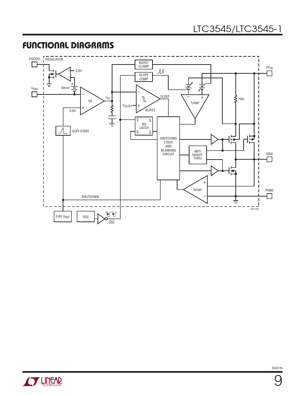 PGOOD REGULATOR BURST CLAMP PVIN + 0.6V SLOPE – COMP + V 50mV FBX – – I SLEEP – + TH 10Ω EA ICOMP + VSLEEP + 0.6V BURST S Q RS LATCH SOFT-START R Q SWITCHING LOGIC AND BLANKING ANTI CIRCUIT SHOOT- SWX THRU + IRCMP PGND – SHUTDOWN 3545 FD02 0.6V VREF OSC OSC 35451fb 9