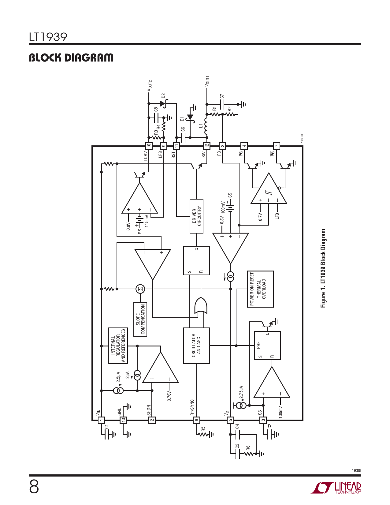 TION SLOPE COMPENSA Q TOR TOR PRE INTERNAL AND AGC REGULA OSCILLA S R AND REFERENCES 2μA + – 2.5μA + – 2.75μA 0.76V /SYNC IN T C V GND SHDN R V SS 100mV 1 13 2 6 5 3 C1 C4 C2 R5 C3 R6 1939f 8