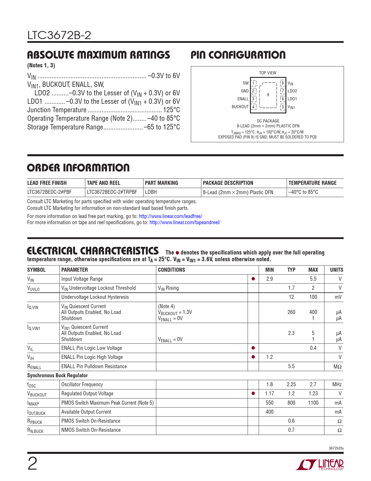 LTC3672B-2 ABSOLUTE MAXIMUM RATINGSPIN CONFIGURATION(Notes 1, 3) V TOP VIEW IN ... –0.3V to 6V V SW 1 8 V IN1, BUCKOUT, ENALL, SW, IN LDO2 ..–0.3V to the Lesser of (V GND 2 7 LDO2 IN + 0.3V) or 6V 9 LDO1 .. –0.3V to the Lesser of (V ENALL 3 6 LDO1 IN1 + 0.3V) or 6V Junction Temperature ... 125°C BUCKOUT 4 5 VIN1 Operating Temperature Range (Note 2).. –40 to 85°C DC PACKAGE Storage Temperature Range ... –65 to 125°C 8-LEAD (2mm s 2mm) PLASTIC DFN TJMAX = 125°C, θJA = 102°C/W, θJC = 20°C/W EXPOSED PAD (PIN 9) IS GND, MUST BE SOLDERED TO PCB ORDER INFORMATIONLEAD FREE FINISHTAPE AND REELPART MARKINGPACKAGE DESCRIPTIONTEMPERATURE RANGE LTC3672BEDC-2#PBF LTC3672BEDC-2#TRPBF LDBH 8-Lead (2mm × 2mm) Plastic DFN –40°C to 85°C Consult LTC Marketing for parts specifi ed with wider operating temperature ranges. Consult LTC Marketing for information on non-standard lead based fi nish parts. For more information on lead free part marking, go to: http://www.linear.com/leadfree/ For more information on tape and reel specifi cations, go to: http://www.linear.com/tapeandreel/ ELECTRICAL CHARACTERISTICSThe l denotes the specifi cations which apply over the full operatingtemperature range, otherwise specifi cations are at TA = 25°C. VIN = VIN1 = 3.6V, unless otherwise noted.SYMBOLPARAMETERCONDITIONSMINTYPMAXUNITS VIN Input Voltage Range l 2.9 5.5 V VUVLO VIN Undervoltage Lockout Threshold VIN Rising 1.7 2 V Undervoltage Lockout Hysteresis 12 100 mV IQ,VIN VIN Quiescent Current (Note 4) All Outputs Enabled, No Load VBUCKOUT = 1.3V 260 400 μA Shutdown VENALL = 0V 1 μA IQ,VIN1 VIN1 Quiescent Current All Outputs Enabled, No Load 2.3 5 μA Shutdown VENALL = 0V 1 μA VIL ENALL Pin Logic Low Voltage l 0.4 V VIH ENALL Pin Logic High Voltage l 1.2 V RENALL ENALL Pin Pulldown Resistance 5.5 MΩ Synchronous Buck Regulator fOSC Oscillator Frequency 1.8 2.25 2.7 MHz VBUCKOUT Regulated Output Voltage l 1.17 1.2 1.23 V IMAXP PMOS Switch Maximum Peak Current (Note 5) 550 800 1100 mA IOUT,BUCK Available Output Current 400 mA RP,BUCK PMOS Switch On-Resistance 0.6 Ω RN,BUCK NMOS Switch On-Resistance 0.7 Ω 3672b2fa 2