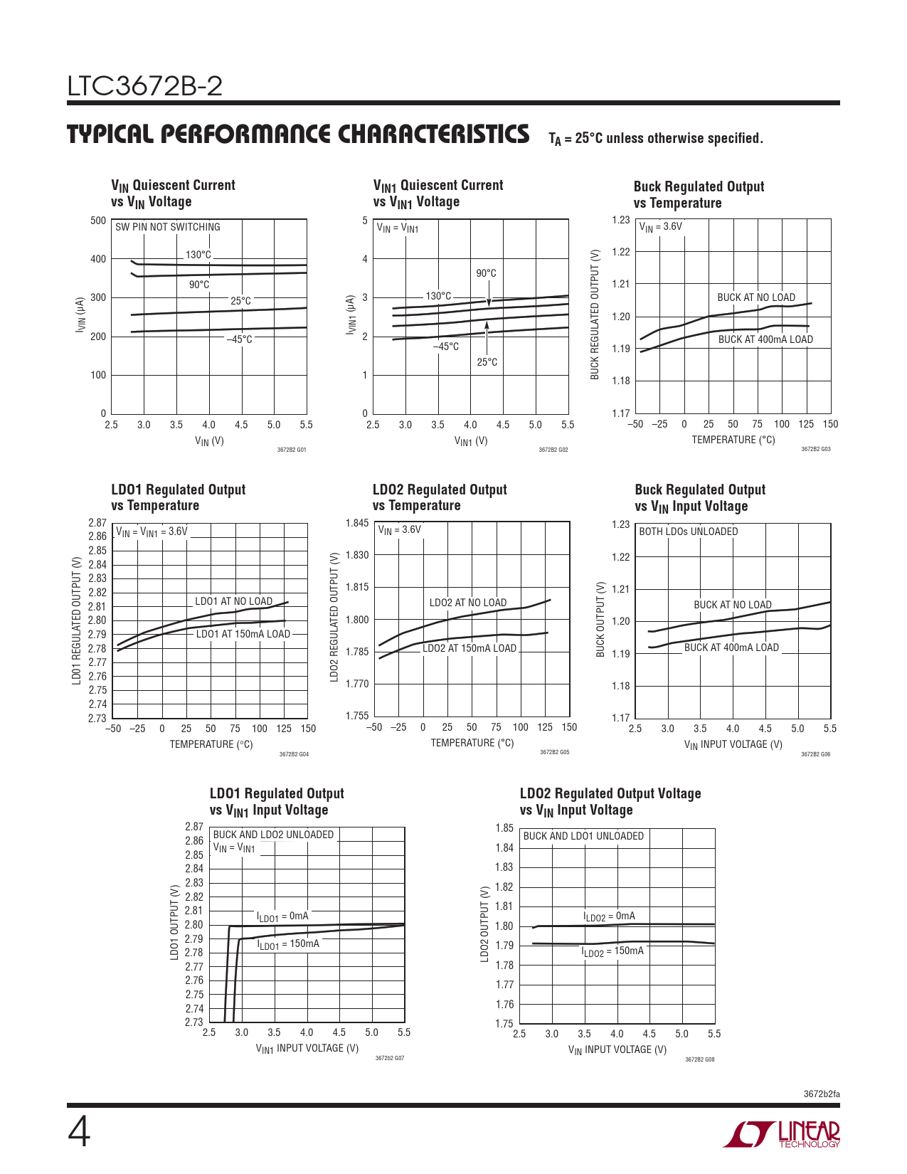 500 5 1.23 SW PIN NOT SWITCHING V V IN = VIN1 IN = 3.6V 1.22 400 130°C 4 90°C 90°C 1.21 300 3 130°C BUCK AT NO LOAD 25°C (μA) (μA) TED OUTPUT (V) 1.20 I VIN 200 I VIN1 –45°C 2 BUCK AT 400mA LOAD –45°C 1.19 25°C 100 1 BUCK REGULA 1.18 0 0 1.17 2.5 3.0 3.5 4.0 4.5 5.0 5.5 2.5 3.0 3.5 4.0 4.5 5.0 5.5 –50 –25 0 25 50 75 100 125 150 V V TEMPERATURE (°C) IN (V) IN1 (V) 3672B2 G01 3672B2 G02 3672B2 G03