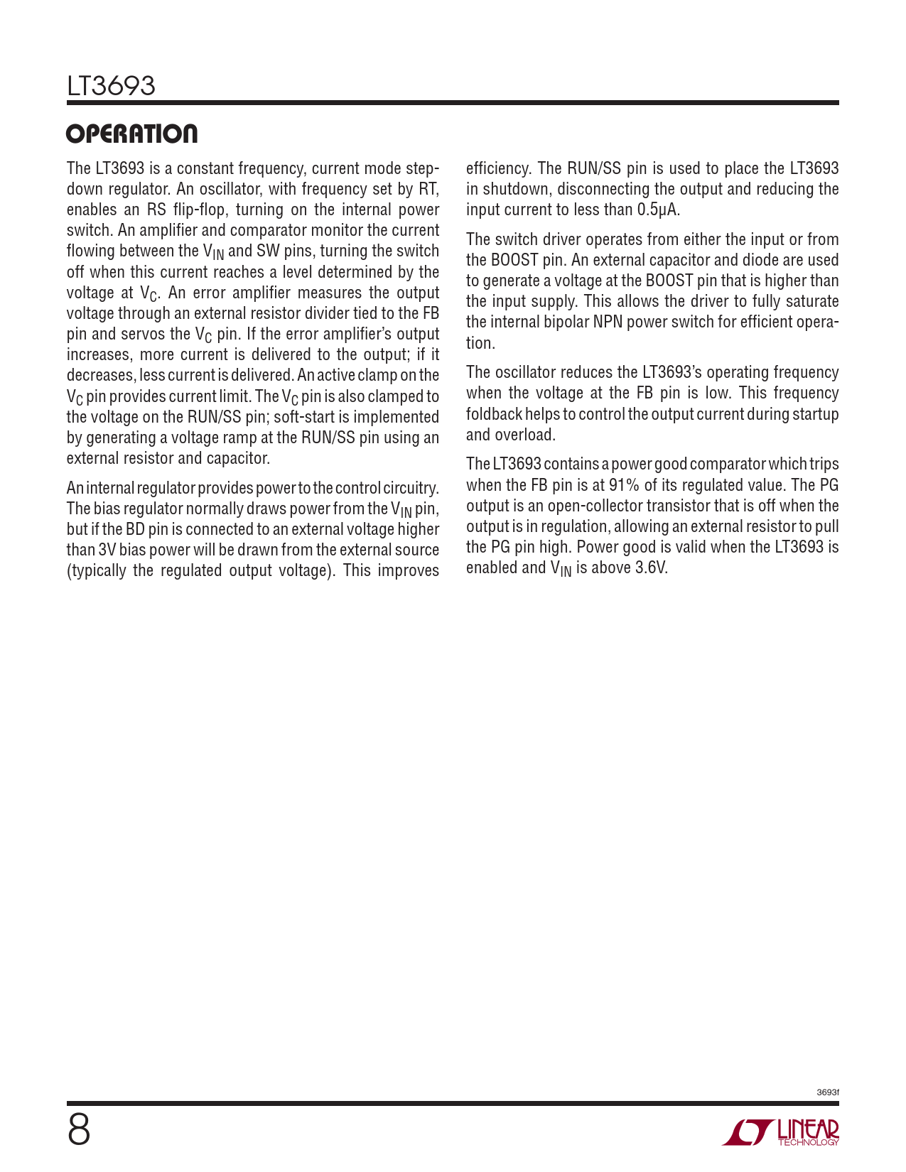 The LT3693 is a constant frequency, current mode step- effi ciency. The RUN/SS pin is used to place the LT3693 down regulator. An oscillator, with frequency set by RT, in shutdown, disconnecting the output and reducing the enables an RS fl ip-fl op, turning on the internal power input current to less than 0.5μA. switch. An amplifi er and comparator monitor the current The switch driver operates from either the input or from fl owing between the VIN and SW pins, turning the switch the BOOST pin. An external capacitor and diode are used off when this current reaches a level determined by the to generate a voltage at the BOOST pin that is higher than voltage at VC. An error amplifi er measures the output the input supply. This allows the driver to fully saturate voltage through an external resistor divider tied to the FB the internal bipolar NPN power switch for effi cient opera- pin and servos the VC pin. If the error amplifi er’s output tion. increases, more current is delivered to the output; if it decreases, less current is delivered. An active clamp on the The oscillator reduces the LT3693’s operating frequency V when the voltage at the FB pin is low. This frequency C pin provides current limit. The VC pin is also clamped to the voltage on the RUN/SS pin; soft-start is implemented foldback helps to control the output current during startup by generating a voltage ramp at the RUN/SS pin using an and overload. external resistor and capacitor. The LT3693 contains a power good comparator which trips An internal regulator provides power to the control circuitry. when the FB pin is at 91% of its regulated value. The PG The bias regulator normally draws power from the V output is an open-collector transistor that is off when the IN pin, but if the BD pin is connected to an external voltage higher output is in regulation, allowing an external resistor to pull than 3V bias power will be drawn from the external source the PG pin high. Power good is valid when the LT3693 is (typically the regulated output voltage). This improves enabled and VIN is above 3.6V. 3693f 8