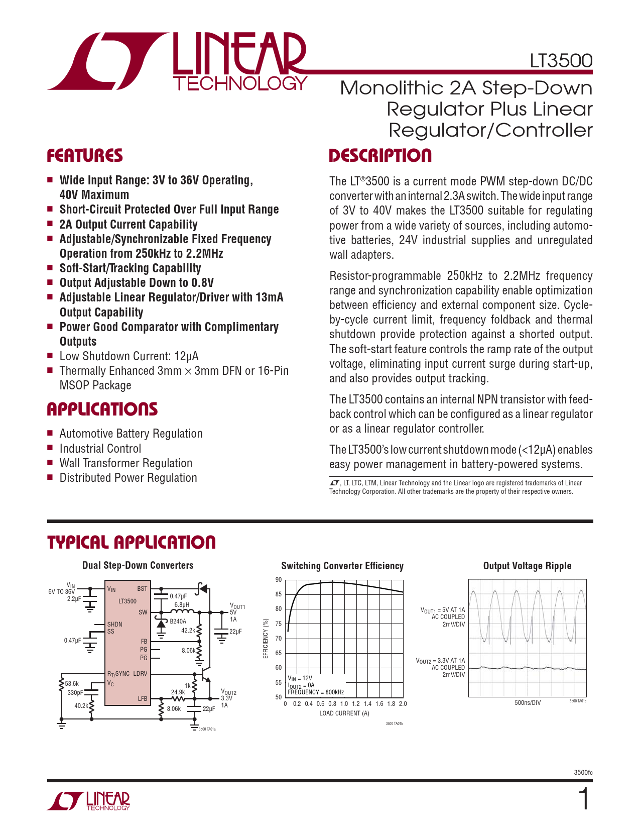 LT3500 Monolithic 2A Step-Down Regulator Plus Linear Regulator/Controller FEATURESDESCRIPTION n Wide Input Range: 3V to 36V Operating, The LT®3500 is a current mode PWM step-down DC/DC 40V Maximum converter with an internal 2.3A switch. The wide input range n Short-Circuit Protected Over Full Input Range of 3V to 40V makes the LT3500 suitable for regulating n 2A Output Current Capability power from a wide variety of sources, including automo- n Adjustable/Synchronizable Fixed Frequency tive batteries, 24V industrial supplies and unregulated Operation from 250kHz to 2.2MHz wall adapters. n Soft-Start/Tracking Capability Resistor-programmable 250kHz to 2.2MHz frequency n Output Adjustable Down to 0.8V range and synchronization capability enable optimization n Adjustable Linear Regulator/Driver with 13mA between effi ciency and external component size. Cycle- Output Capability by-cycle current limit, frequency foldback and thermal n Power Good Comparator with Complimentary shutdown provide protection against a shorted output. Outputs The soft-start feature controls the ramp rate of the output n Low Shutdown Current: 12μA voltage, eliminating input current surge during start-up, n Thermally Enhanced 3mm × 3mm DFN or 16-Pin and also provides output tracking. MSOP Package The LT3500 contains an internal NPN transistor with feed- APPLICATIONS back control which can be confi gured as a linear regulator or as a linear regulator controller. n Automotive Battery Regulation n Industrial Control The LT3500’s low current shutdown mode (<12μA) enables n Wall Transformer Regulation easy power management in battery-powered systems. n Distributed Power Regulation L, LT, LTC, LTM, Linear Technology and the Linear logo are registered trademarks of Linear Technology Corporation. All other trademarks are the property of their respective owners. TYPICAL APPLICATIONDual Step-Down ConvertersSwitching Converter Effi ciencyOutput Voltage Ripple 90 VIN V BST 6V TO 36V IN 0.47μF 85 2.2μF LT3500 6.8μH VOUT1 80 SW 5V VOUT1 = 5V AT 1A 1A AC COUPLED B240A SHDN 75 2mV/DIV 42.2k SS 22μF 0.47μF FB 70 PG 8.06k 65 PG EFFICIENCY (%) VOUT2 = 3.3V AT 1A 60 AC COUPLED RT/SYNC LDRV 2mV/DIV VIN = 12V 53.6k VC 55 1k IOUT2 = 0A 330pF 24.9k VOUT2 FREQUENCY = 800kHz LFB 3.3V 50 500ns/DIV 3500 TA01c 40.2k 1A 0 0.2 0.4 0.6 0.8 1.0 1.2 1.4 1.6 1.8 2.0 8.06k 22μF LOAD CURRENT (A) 3500 TA01b 3500 TA01a 3500fc 1