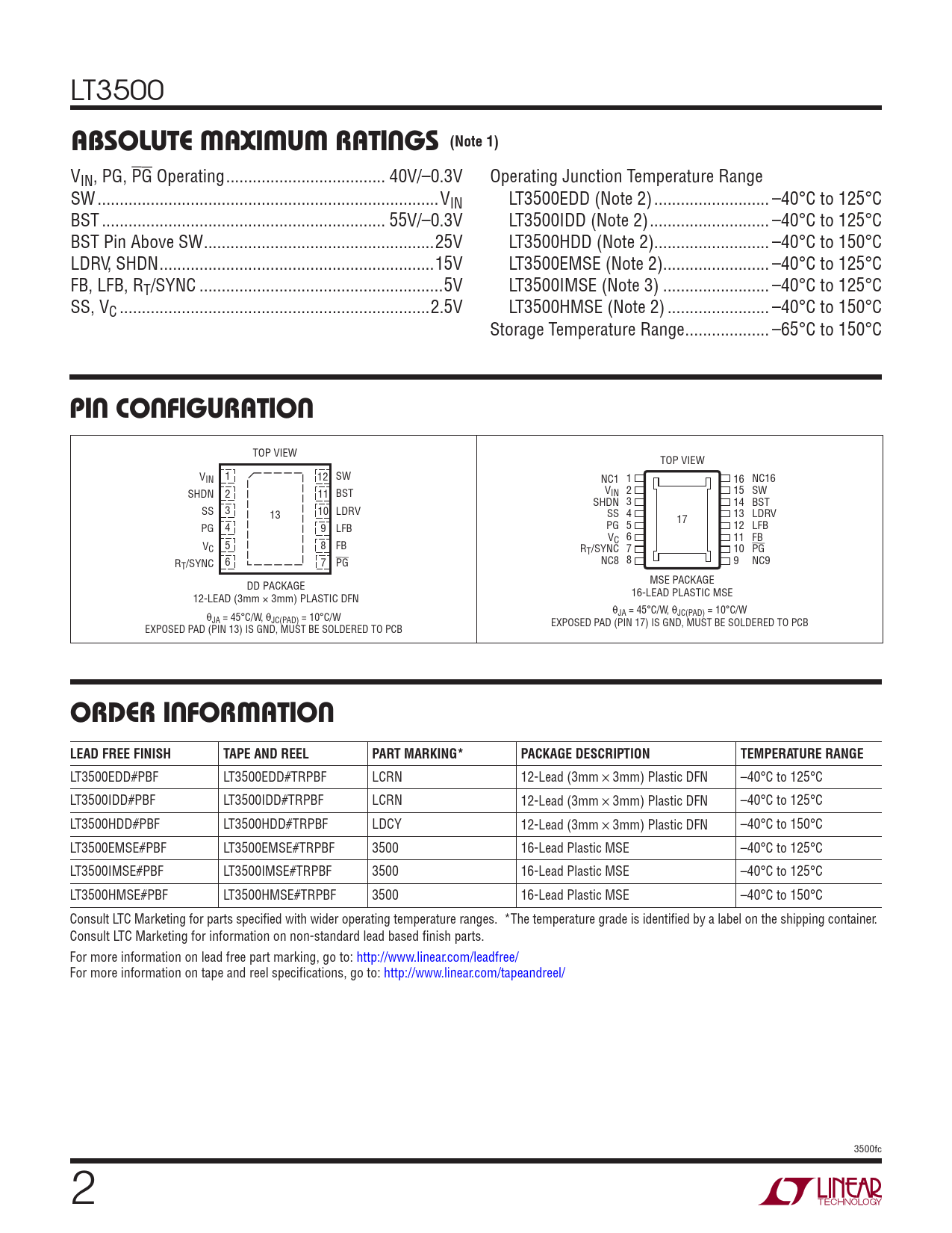 LT3500EDD#PBF LT3500EDD#TRPBF LCRN 12-Lead (3mm × 3mm) Plastic DFN –40°C to 125°C LT3500IDD#PBF LT3500IDD#TRPBF LCRN 12-Lead (3mm × 3mm) Plastic DFN –40°C to 125°C LT3500HDD#PBF LT3500HDD#TRPBF LDCY 12-Lead (3mm × 3mm) Plastic DFN –40°C to 150°C LT3500EMSE#PBF LT3500EMSE#TRPBF 3500 16-Lead Plastic MSE –40°C to 125°C LT3500IMSE#PBF LT3500IMSE#TRPBF 3500 16-Lead Plastic MSE –40°C to 125°C LT3500HMSE#PBF LT3500HMSE#TRPBF 3500 16-Lead Plastic MSE –40°C to 150°C Consult LTC Marketing for parts specifi ed with wider operating temperature ranges. *The temperature grade is identifi ed by a label on the shipping container. Consult LTC Marketing for information on non-standard lead based fi nish parts. For more information on lead free part marking, go to: http://www.linear.com/leadfree/ For more information on tape and reel specifi cations, go to: http://www.linear.com/tapeandreel/ 3500fc 2