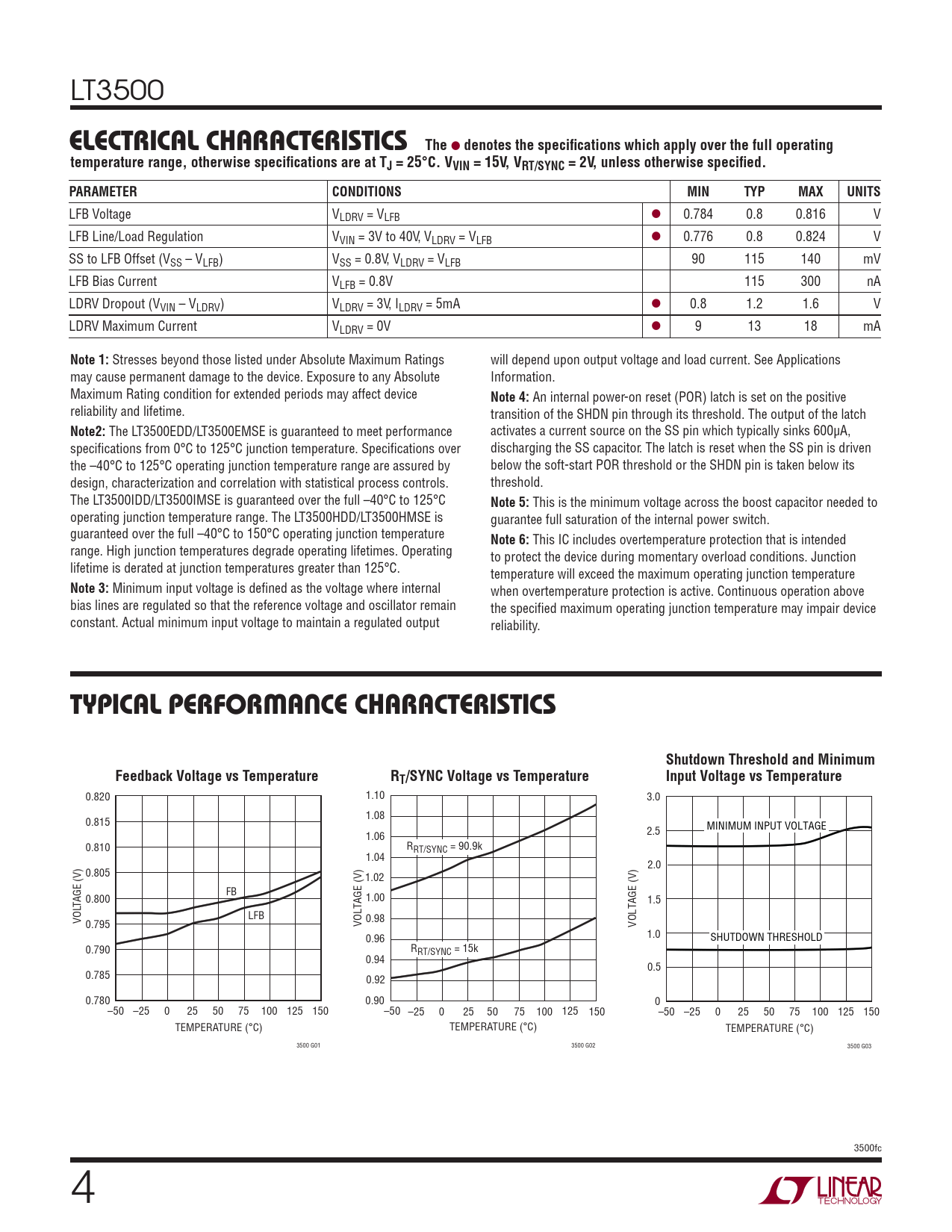 LT3500 ELECTRICAL CHARACTERISTICSThe l denotes the specifi cations which apply over the full operatingtemperature range, otherwise specifi cations are at TJ = 25°C. VVIN = 15V, VRT/SYNC = 2V, unless otherwise specifi ed.PARAMETERCONDITIONSMINTYPMAXUNITS LFB Voltage VLDRV = VLFB l 0.784 0.8 0.816 V LFB Line/Load Regulation VVIN = 3V to 40V, VLDRV = VLFB l 0.776 0.8 0.824 V SS to LFB Offset (VSS – VLFB) VSS = 0.8V, VLDRV = VLFB 90 115 140 mV LFB Bias Current VLFB = 0.8V 115 300 nA LDRV Dropout (VVIN – VLDRV) VLDRV = 3V, ILDRV = 5mA l 0.8 1.2 1.6 V LDRV Maximum Current VLDRV = 0V l 9 13 18 mA Note 1: Stresses beyond those listed under Absolute Maximum Ratings will depend upon output voltage and load current. See Applications may cause permanent damage to the device. Exposure to any Absolute Information. Maximum Rating condition for extended periods may affect device Note 4: An internal power-on reset (POR) latch is set on the positive reliability and lifetime. transition of the SHDN pin through its threshold. The output of the latch Note2: The LT3500EDD/LT3500EMSE is guaranteed to meet performance activates a current source on the SS pin which typically sinks 600μA, specifi cations from 0°C to 125°C junction temperature. Specifi cations over discharging the SS capacitor. The latch is reset when the SS pin is driven the –40°C to 125°C operating junction temperature range are assured by below the soft-start POR threshold or the SHDN pin is taken below its design, characterization and correlation with statistical process controls. threshold. The LT3500IDD/LT3500IMSE is guaranteed over the full –40°C to 125°C Note 5: This is the minimum voltage across the boost capacitor needed to operating junction temperature range. The LT3500HDD/LT3500HMSE is guarantee full saturation of the internal power switch. guaranteed over the full –40°C to 150°C operating junction temperature Note 6: This IC includes overtemperature protection that is intended range. High junction temperatures degrade operating lifetimes. Operating to protect the device during momentary overload conditions. Junction lifetime is derated at junction temperatures greater than 125°C. temperature will exceed the maximum operating junction temperature Note 3: Minimum input voltage is defi ned as the voltage where internal when overtemperature protection is active. Continuous operation above bias lines are regulated so that the reference voltage and oscillator remain the specifi ed maximum operating junction temperature may impair device constant. Actual minimum input voltage to maintain a regulated output reliability. TYPICAL PERFORMANCE CHARACTERISTICSShutdown Threshold and MinimumFeedback Voltage vs TemperatureRT/SYNC Voltage vs TemperatureInput Voltage vs Temperature 0.820 1.10 3.0 1.08 0.815 MINIMUM INPUT VOLTAGE 1.06 2.5 0.810 RRT/SYNC = 90.9k 1.04 2.0 0.805 1.02 FB 1.00 TAGE (V) 0.800 1.5 VOL LFB 0.98 0.795 VOLTAGE (V) VOLTAGE (V) 0.96 1.0 SHUTDOWN THRESHOLD 0.790 RRT/SYNC = 15k 0.94 0.5 0.785 0.92 0.780 0.90 0 –50 –25 0 25 50 75 100 125 150 –50 –25 0 25 50 75 100 125 150 –50 –25 0 25 50 75 100 125 150 TEMPERATURE (°C) TEMPERATURE (°C) TEMPERATURE (°C) 3500 G01 3500 G02 3500 G03 3500fc 4