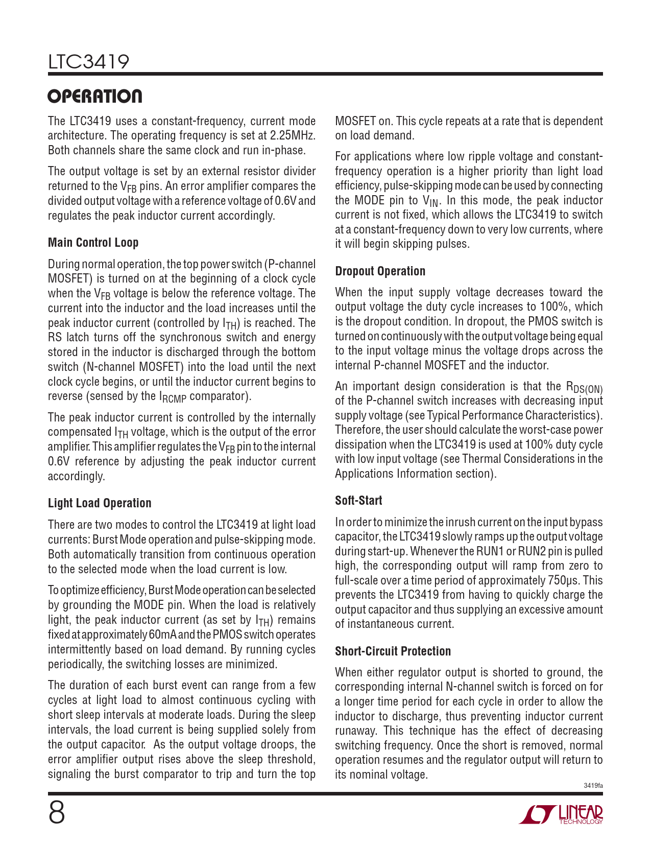 LTC3419 OPERATION The LTC3419 uses a constant-frequency, current mode MOSFET on. This cycle repeats at a rate that is dependent architecture. The operating frequency is set at 2.25MHz. on load demand. Both channels share the same clock and run in-phase. For applications where low ripple voltage and constant- The output voltage is set by an external resistor divider frequency operation is a higher priority than light load returned to the VFB pins. An error amplifi er compares the effi ciency, pulse-skipping mode can be used by connecting divided output voltage with a reference voltage of 0.6V and the MODE pin to VIN. In this mode, the peak inductor regulates the peak inductor current accordingly. current is not fi xed, which allows the LTC3419 to switch at a constant-frequency down to very low currents, where Main Control Loop it will begin skipping pulses. During normal operation, the top power switch (P-channel Dropout Operation MOSFET) is turned on at the beginning of a clock cycle when the VFB voltage is below the reference voltage. The When the input supply voltage decreases toward the current into the inductor and the load increases until the output voltage the duty cycle increases to 100%, which peak inductor current (controlled by ITH) is reached. The is the dropout condition. In dropout, the PMOS switch is RS latch turns off the synchronous switch and energy turned on continuously with the output voltage being equal stored in the inductor is discharged through the bottom to the input voltage minus the voltage drops across the switch (N-channel MOSFET) into the load until the next internal P-channel MOSFET and the inductor. clock cycle begins, or until the inductor current begins to An important design consideration is that the RDS(ON) reverse (sensed by the IRCMP comparator). of the P-channel switch increases with decreasing input The peak inductor current is controlled by the internally supply voltage (see Typical Performance Characteristics). compensated I Therefore, the user should calculate the worst-case power TH voltage, which is the output of the error amplifi er. This amplifi er regulates the V dissipation when the LTC3419 is used at 100% duty cycle FB pin to the internal 0.6V reference by adjusting the peak inductor current with low input voltage (see Thermal Considerations in the accordingly. Applications Information section). Light Load OperationSoft-Start There are two modes to control the LTC3419 at light load In order to minimize the inrush current on the input bypass currents: Burst Mode operation and pulse-skipping mode. capacitor, the LTC3419 slowly ramps up the output voltage Both automatically transition from continuous operation during start-up. Whenever the RUN1 or RUN2 pin is pulled to the selected mode when the load current is low. high, the corresponding output will ramp from zero to full-scale over a time period of approximately 750μs. This To optimize effi ciency, Burst Mode operation can be selected prevents the LTC3419 from having to quickly charge the by grounding the MODE pin. When the load is relatively output capacitor and thus supplying an excessive amount light, the peak inductor current (as set by ITH) remains of instantaneous current. fi xed at approximately 60mA and the PMOS switch operates intermittently based on load demand. By running cycles Short-Circuit Protection periodically, the switching losses are minimized. When either regulator output is shorted to ground, the The duration of each burst event can range from a few corresponding internal N-channel switch is forced on for cycles at light load to almost continuous cycling with a longer time period for each cycle in order to allow the short sleep intervals at moderate loads. During the sleep inductor to discharge, thus preventing inductor current intervals, the load current is being supplied solely from runaway. This technique has the effect of decreasing the output capacitor. As the output voltage droops, the switching frequency. Once the short is removed, normal error amplifi er output rises above the sleep threshold, operation resumes and the regulator output will return to signaling the burst comparator to trip and turn the top its nominal voltage. 3419fa 8