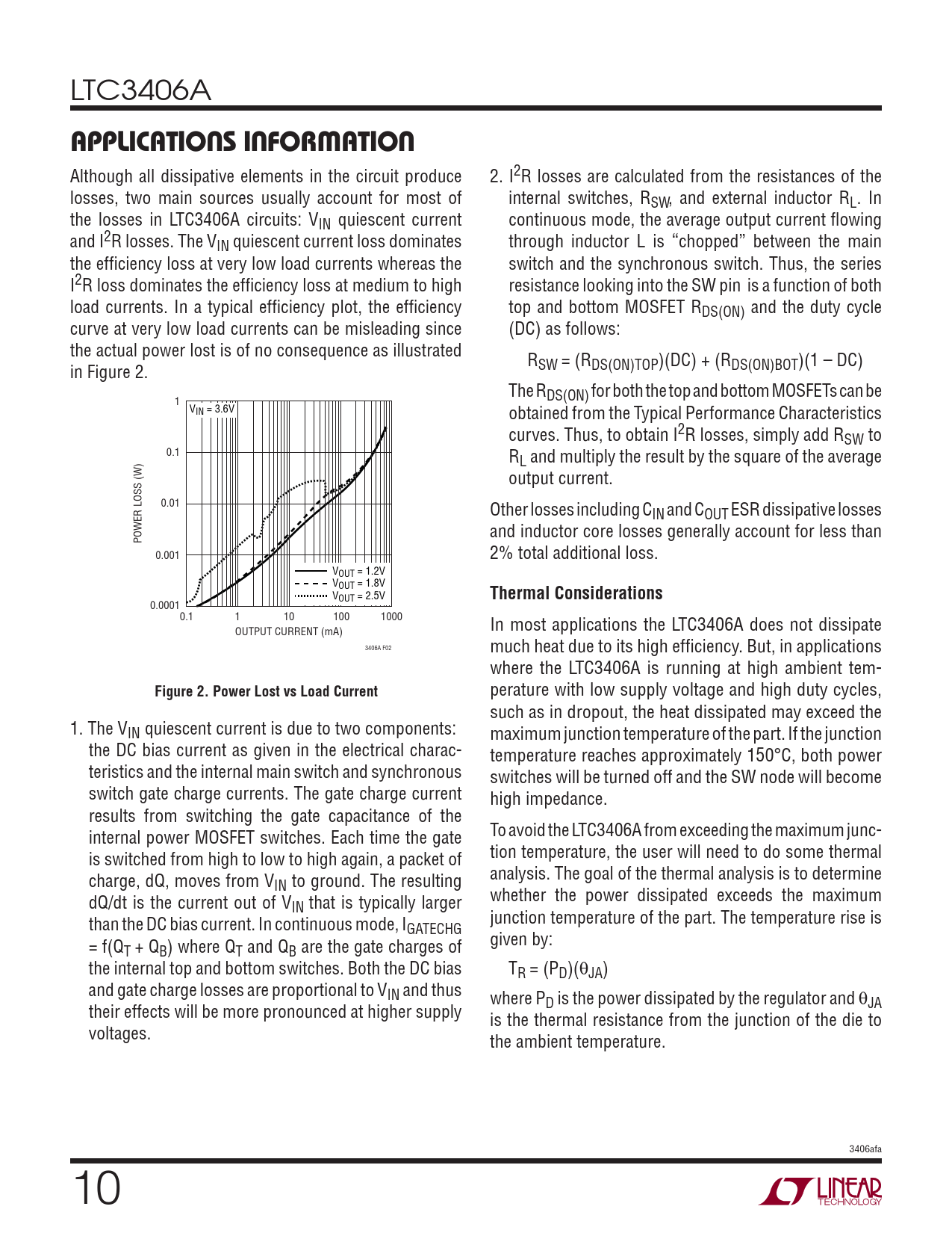 perature with low supply voltage and high duty cycles, such as in dropout, the heat dissipated may exceed the 1. The VIN quiescent current is due to two components: maximum junction temperature of the part. If the junction the DC bias current as given in the electrical charac- temperature reaches approximately 150°C, both power teristics and the internal main switch and synchronous switches will be turned off and the SW node will become switch gate charge currents. The gate charge current high impedance. results from switching the gate capacitance of the To avoid the LTC3406A from exceeding the maximum junc- internal power MOSFET switches. Each time the gate tion temperature, the user will need to do some thermal is switched from high to low to high again, a packet of analysis. The goal of the thermal analysis is to determine charge, dQ, moves from VIN to ground. The resulting whether the power dissipated exceeds the maximum dQ/dt is the current out of VIN that is typically larger junction temperature of the part. The temperature rise is than the DC bias current. In continuous mode, IGATECHG given by: = f(QT + QB) where QT and QB are the gate charges of the internal top and bottom switches. Both the DC bias TR = (PD)(θJA) and gate charge losses are proportional to VIN and thus where PD is the power dissipated by the regulator and θJA their effects will be more pronounced at higher supply is the thermal resistance from the junction of the die to voltages. the ambient temperature. 3406afa 10