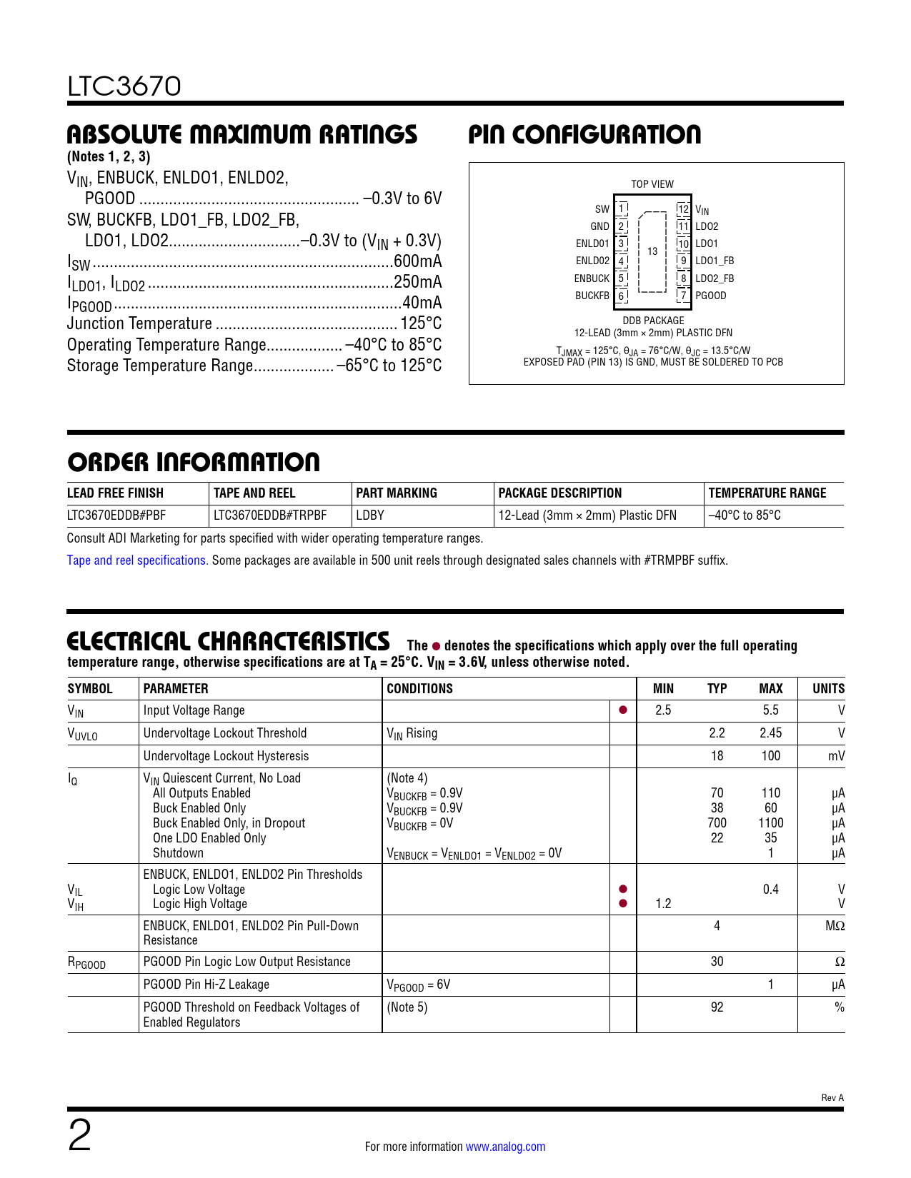 LTC3670EDDB#PBF LTC3670EDDB#TRPBF LDBY 12-Lead (3mm × 2mm) Plastic DFN –40°C to 85°C Consult ADI Marketing for parts specified with wider operating temperature ranges. Tape and reel specifications. Some packages are available in 500 unit reels through designated sales channels with #TRMPBF suffix.
