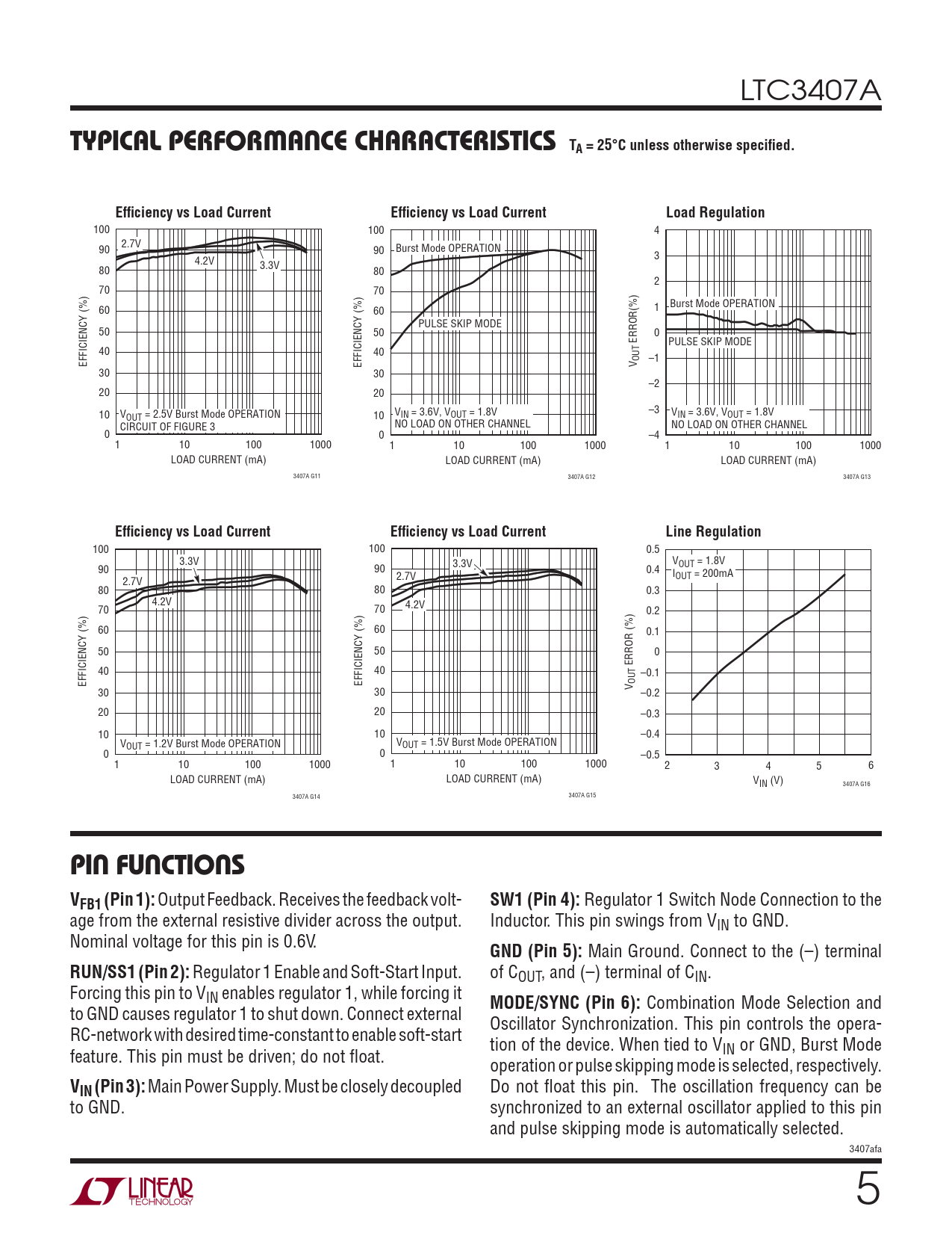 LTC3407A TYPICAL PERFORMANCE CHARACTERISTICS TA = 25°C unless otherwise specifi ed.Effi ciency vs Load CurrentEffi ciency vs Load CurrentLoad Regulation 100 100 4 2.7V 90 90 Burst Mode OPERATION 3 4.2V 80 3.3V 80 2 70 70 Burst Mode OPERATION 60 60 1 PULSE SKIP MODE 50 50 0 ERROR(%) PULSE SKIP MODE 40 40 EFFICIENCY (%) OUT –1 EFFICIENCY (%) V 30 30 –2 20 20 10 V V –3 V OUT = 2.5V Burst Mode OPERATION 10 IN = 3.6V, VOUT = 1.8V IN = 3.6V, VOUT = 1.8V CIRCUIT OF FIGURE 3 NO LOAD ON OTHER CHANNEL NO LOAD ON OTHER CHANNEL 0 0 –4 1 10 100 1000 1 10 100 1000 1 10 100 1000 LOAD CURRENT (mA) LOAD CURRENT (mA) LOAD CURRENT (mA) 3407A G11 3407A G12 3407A G13 Effi ciency vs Load CurrentEffi ciency vs Load CurrentLine Regulation 100 100 0.5 3.3V 3.3V VOUT = 1.8V 90 90 0.4 IOUT = 200mA 2.7V 2.7V 80 80 0.3 4.2V 70 70 4.2V 0.2 60 60 0.1 50 50 0 ERROR (%) 40 40 –0.1 EFFICIENCY (%) EFFICIENCY (%) OUTV 30 30 –0.2 20 20 –0.3 10 10 –0.4 VOUT = 1.2V Burst Mode OPERATION VOUT = 1.5V Burst Mode OPERATION 0 0 –0.5 1 10 100 1000 1 10 100 1000 2 3 4 5 6 LOAD CURRENT (mA) LOAD CURRENT (mA) VIN (V) 3407A G16 3407A G14 3407A G15 PIN FUNCTIONS VFB1 (Pin 1): Output Feedback. Receives the feedback volt- SW1 (Pin 4): Regulator 1 Switch Node Connection to the age from the external resistive divider across the output. Inductor. This pin swings from VIN to GND. Nominal voltage for this pin is 0.6V. GND (Pin 5): Main Ground. Connect to the (–) terminal RUN/SS1 (Pin 2): Regulator 1 Enable and Soft-Start Input. of COUT, and (–) terminal of CIN. Forcing this pin to VIN enables regulator 1, while forcing it MODE/SYNC (Pin 6): Combination Mode Selection and to GND causes regulator 1 to shut down. Connect external Oscillator Synchronization. This pin controls the opera- RC-network with desired time-constant to enable soft-start tion of the device. When tied to V feature. This pin must be driven; do not fl oat. IN or GND, Burst Mode operation or pulse skipping mode is selected, respectively. VIN (Pin 3): Main Power Supply. Must be closely decoupled Do not fl oat this pin. The oscillation frequency can be to GND. synchronized to an external oscillator applied to this pin and pulse skipping mode is automatically selected. 3407afa 5