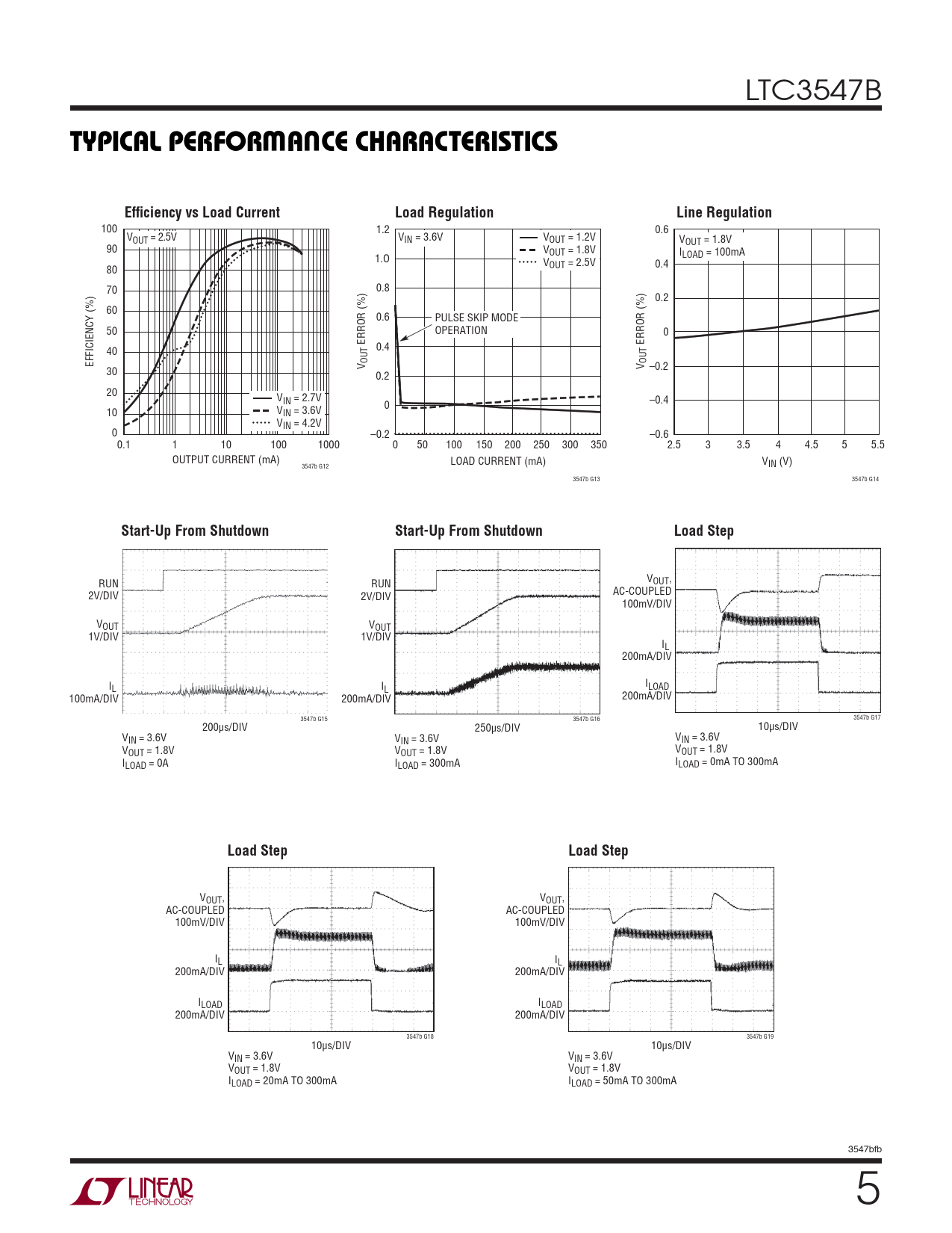 V V OUT, OUT, AC-COUPLED AC-COUPLED 100mV/DIV 100mV/DIV IL IL 200mA/DIV 200mA/DIV I I LOAD LOAD 200mA/DIV 200mA/DIV 3547b G18 3547b G19 10μs/DIV 10μs/DIV V V IN = 3.6V IN = 3.6V V V OUT = 1.8V OUT = 1.8V I I LOAD = 20mA TO 300mA LOAD = 50mA TO 300mA 3547bfb 5