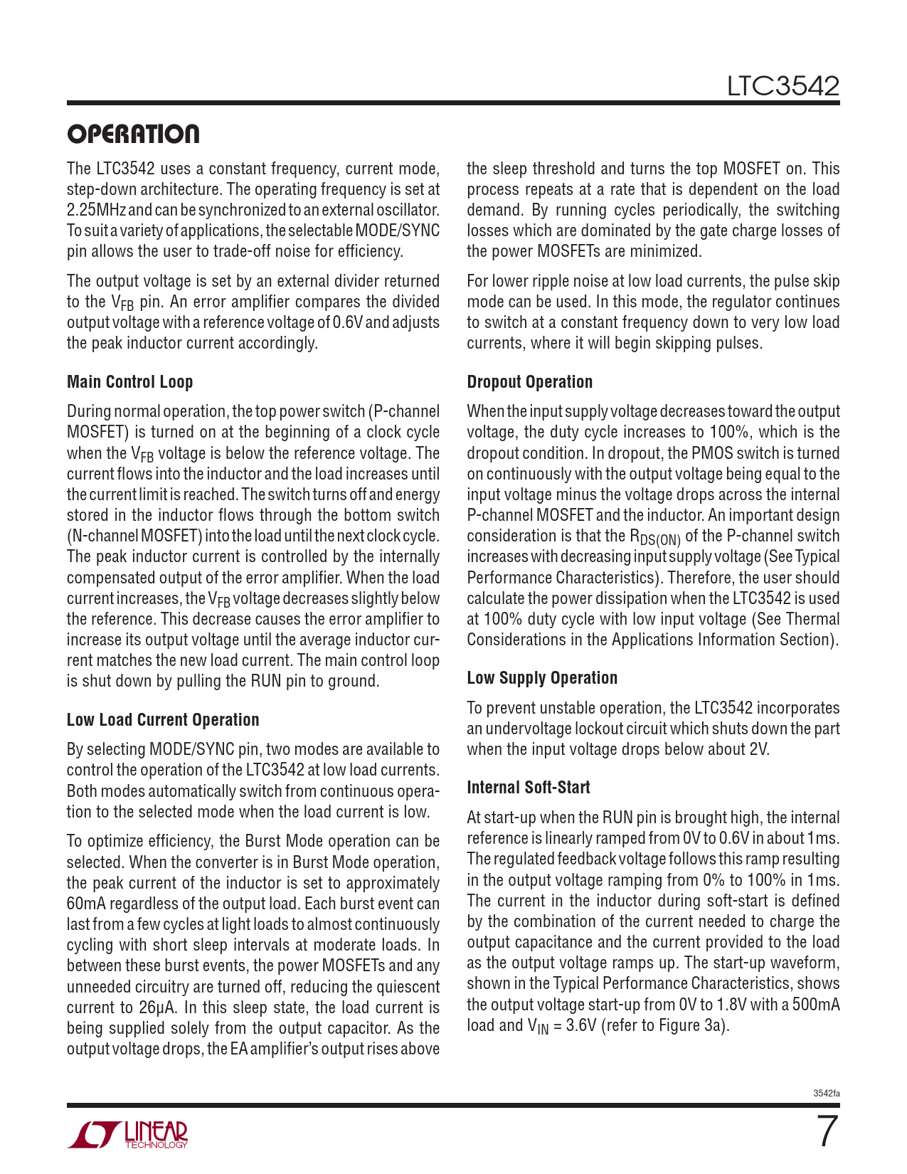 The LTC3542 uses a constant frequency, current mode, the sleep threshold and turns the top MOSFET on. This step-down architecture. The operating frequency is set at process repeats at a rate that is dependent on the load 2.25MHz and can be synchronized to an external oscillator. demand. By running cycles periodically, the switching To suit a variety of applications, the selectable MODE/SYNC losses which are dominated by the gate charge losses of pin allows the user to trade-off noise for effi ciency. the power MOSFETs are minimized. The output voltage is set by an external divider returned For lower ripple noise at low load currents, the pulse skip to the VFB pin. An error amplifi er compares the divided mode can be used. In this mode, the regulator continues output voltage with a reference voltage of 0.6V and adjusts to switch at a constant frequency down to very low load the peak inductor current accordingly. currents, where it will begin skipping pulses.