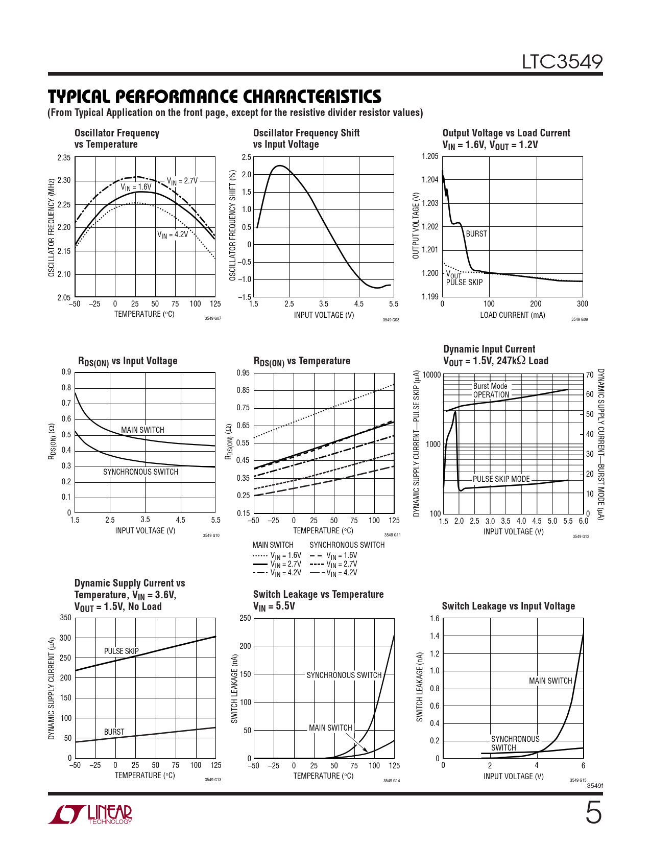 DYNAMIC SUPPLY CURRENT—BURST MODE ( 0.9 0.95 µA) 10000 70 0.8 Burst Mode 0.85 OPERATION 60 0.7 0.75 50 0.6 ) Ω Ω) 0.65 ( MAIN SWITCH 0.5 ( 40 0.55 1000 DS(ON) 0.4 DS(ON) R R 30 0.45 0.3 SYNCHRONOUS SWITCH 20 0.35 0.2 PULSE SKIP MODE 0.1 0.25 10 µ 0 0.15 DYNAMIC SUPPLY CURRENT—PULSE SKIP ( A) 100 0 1.5 2.5 3.5 4.5 5.5 –50 –25 0 25 50 75 100 125 1.5 2.0 2.5 3.0 3.5 4.0 4.5 5.0 5.5 6.0 INPUT VOLTAGE (V) TEMPERATURE (°C) INPUT VOLTAGE (V) 3549 G10 3549 G11 3549 G12 MAIN SWITCH SYNCHRONOUS SWITCH VIN = 1.6V VIN = 1.6V VIN = 2.7V VIN = 2.7V VIN = 4.2V VIN = 4.2V