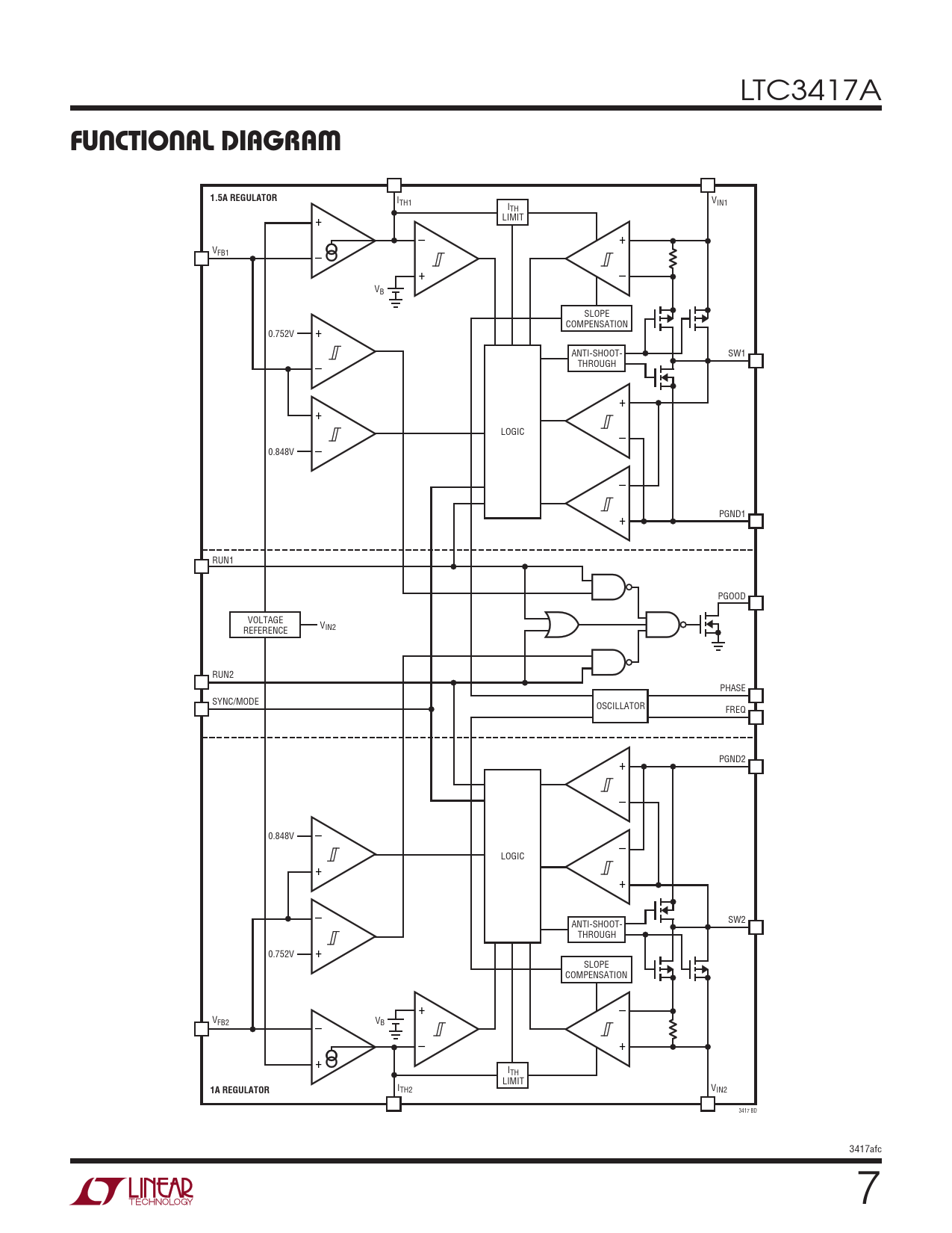 ITH1 V I IN1 TH + LIMIT – + VFB1 – + – VB SLOPE COMPENSATION 0.752V + ANTI-SHOOT- SW1 – THROUGH + + LOGIC – 0.848V – – PGND1 + RUN1 PGOOD VOLTAGE VIN2 REFERENCE RUN2 PHASE SYNC/MODE OSCILLATOR FREQ + PGND2 – – 0.848V – + LOGIC + – SW2 ANTI-SHOOT- THROUGH + 0.752V SLOPE COMPENSATION – + VFB2 – VB + – + ITH LIMIT