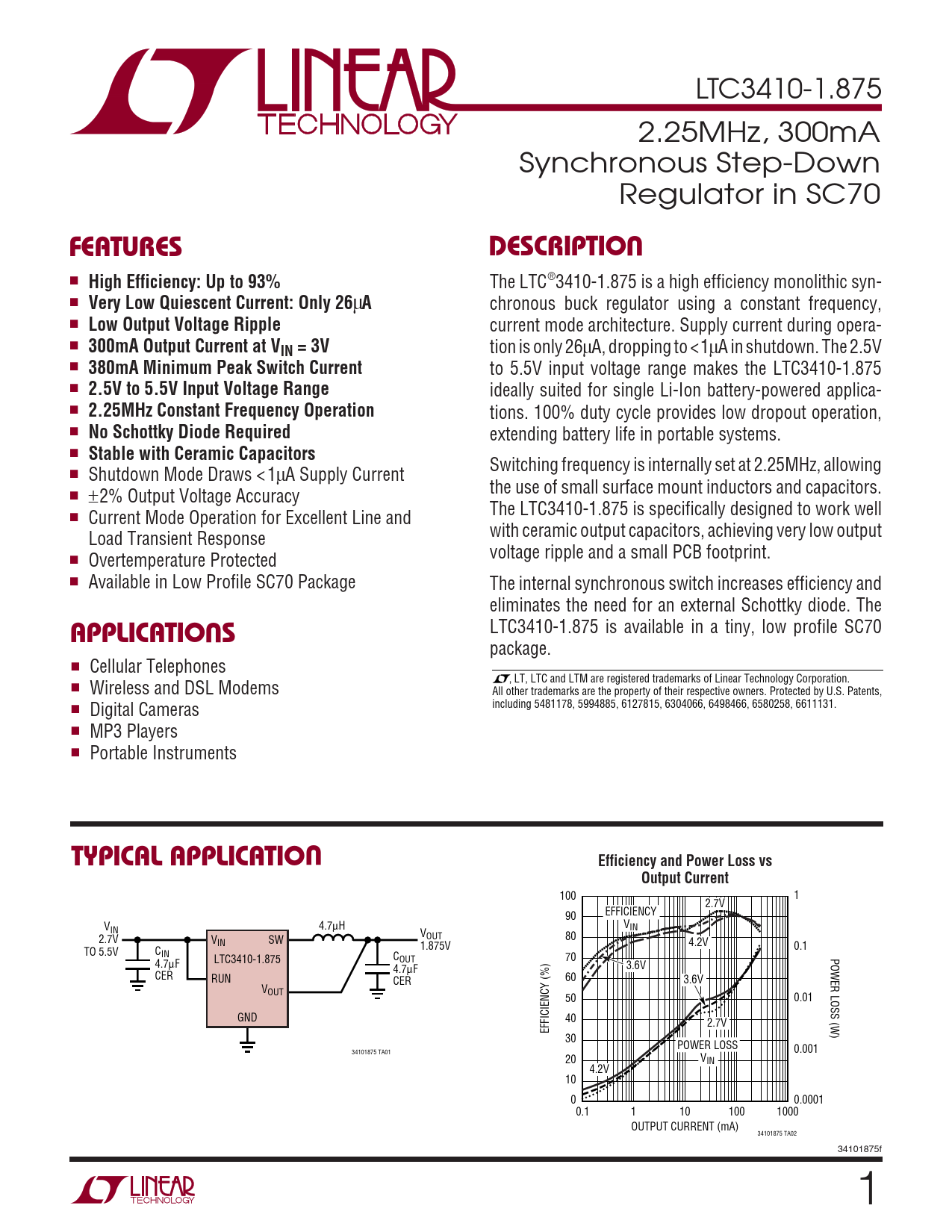 The LTC®3410-1.875 is a high efficiency monolithic syn- ■