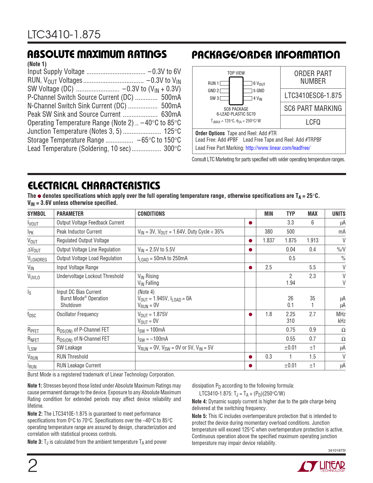 LTC3410-1.875 WWWUUWUABSOLUTE AXI U RATI GSPACKAGE/ORDER I FOR ATIO(Note 1) Input Supply Voltage .. – 0.3V to 6V TOP VIEW ORDER PART RUN, VOUT Voltages... – 0.3V to VIN RUN 1 6 V NUMBER OUT SW Voltage (DC) ... – 0.3V to (VIN + 0.3V) GND 2 5 GND LTC3410ESC6-1.875 P-Channel Switch Source Current (DC) ... 500mA SW 3 4 VIN N-Channel Switch Sink Current (DC) ... 500mA SC6 PACKAGE SC6 PART MARKING Peak SW Sink and Source Current .. 630mA 6-LEAD PLASTIC SC70 Operating Temperature Range (Note 2) .. – 40°C to 85°C TJMAX = 125°C, θJA = 250°C/ W LCFQ Junction Temperature (Notes 3, 5) .. 125°C Order Options Tape and Reel: Add #TR Storage Temperature Range .. – 65°C to 150°C Lead Free: Add #PBF Lead Free Tape and Reel: Add #TRPBF Lead Temperature (Soldering, 10 sec)... 300°C Lead Free Part Marking: http://www.linear.com/leadfree/ Consult LTC Marketing for parts specified with wider operating temperature ranges. ELECTRICAL CHARACTERISTICSThe ● denotes specifications which apply over the full operating temperature range, otherwise specifications are TA = 25 ° C. VIN = 3.6V unless otherwise specified.SYMBOLPARAMETERCONDITIONSMINTYPMAXUNITS IVOUT Output Voltage Feedback Current ● 3.3 6 µA IPK Peak Inductor Current VIN = 3V, VOUT = 1.64V, Duty Cycle < 35% 380 500 mA VOUT Regulated Output Voltage ● 1.837 1.875 1.913 V ∆VOUT Output Voltage Line Regulation VIN = 2.5V to 5.5V ● 0.04 0.4 %/V VLOADREG Output Voltage Load Regulation ILOAD = 50mA to 250mA 0.5 % VIN Input Voltage Range ● 2.5 5.5 V VUVLO Undervoltage Lockout Threshold VIN Rising 2 2.3 V VIN Falling 1.94 V IS Input DC Bias Current (Note 4) Burst Mode® Operation VOUT = 1.945V, ILOAD = 0A 26 35 µA Shutdown VRUN = 0V 0.1 1 µA fOSC Oscillator Frequency VOUT = 1.875V ● 1.8 2.25 2.7 MHz VOUT = 0V 310 kHz RPFET RDS(ON) of P-Channel FET ISW = 100mA 0.75 0.9 Ω RNFET RDS(ON) of N-Channel FET ISW = –100mA 0.55 0.7 Ω ILSW SW Leakage VRUN = 0V, VSW = 0V or 5V, VIN = 5V ±0.01 ±1 µA VRUN RUN Threshold ● 0.3 1 1.5 V IRUN RUN Leakage Current ● ±0.01 ±1 µA Burst Mode is a registered trademark of Linear Technology Corporation. Note 1: Stresses beyond those listed under Absolute Maximum Ratings may dissipation PD according to the following formula: cause permanent damage to the device. Exposure to any Absolute Maximum LTC3410-1.875: TJ = TA + (PD)(250°C/W) Rating condition for extended periods may affect device reliability and Note 4: Dynamic supply current is higher due to the gate charge being lifetime. delivered at the switching frequency. Note 2: The LTC3410E-1.875 is guaranteed to meet performance Note 5: This IC includes overtemperature protection that is intended to specifications from 0°C to 70°C. Specifications over the –40°C to 85°C protect the device during momentary overload conditions. Junction operating temperature range are assured by design, characterization and temperature will exceed 125°C when overtemperature protection is active. correlation with statistical process controls. Continuous operation above the specified maximum operating junction Note 3: TJ is calculated from the ambient temperature TA and power temperature may impair device reliability. 34101875f 2