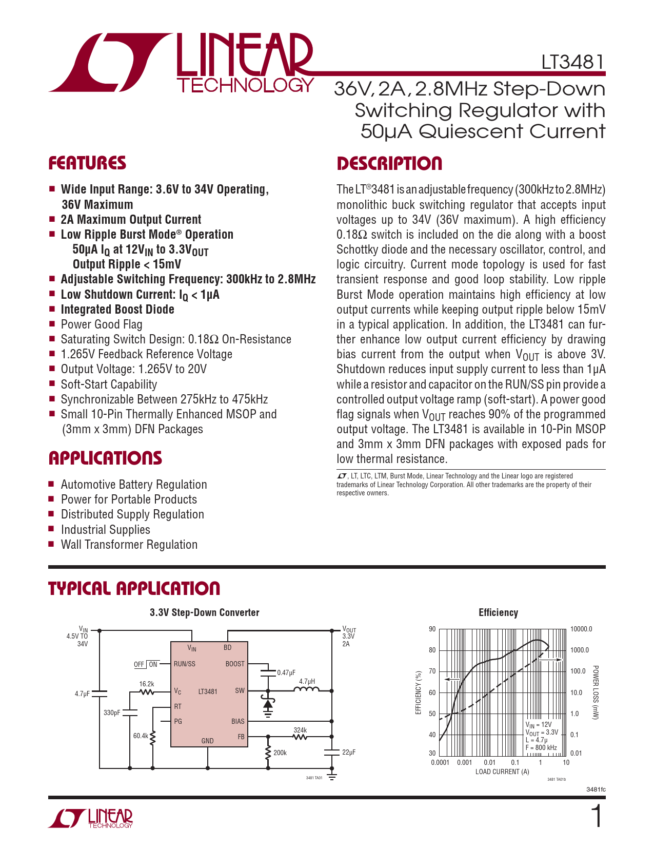 LT3481 36V, 2A, 2.8MHz Step-Down Switching Regulator with 50µA Quiescent Current FEATURESDESCRIPTION ■ Wide Input Range: 3.6V to 34V Operating, The LT®3481 is an adjustable frequency (300kHz to 2.8MHz) 36V Maximum monolithic buck switching regulator that accepts input ■ 2A Maximum Output Current voltages up to 34V (36V maximum). A high effi ciency ■ Low Ripple Burst Mode® Operation 0.18Ω switch is included on the die along with a boost 50μA IQ at 12VIN to 3.3VOUT Schottky diode and the necessary oscillator, control, and Output Ripple < 15mV logic circuitry. Current mode topology is used for fast ■ Adjustable Switching Frequency: 300kHz to 2.8MHz transient response and good loop stability. Low ripple ■ Low Shutdown Current: IQ < 1μA Burst Mode operation maintains high effi ciency at low ■ Integrated Boost Diode output currents while keeping output ripple below 15mV ■ Power Good Flag in a typical application. In addition, the LT3481 can fur- ■ Saturating Switch Design: 0.18Ω On-Resistance ther enhance low output current effi ciency by drawing ■ 1.265V Feedback Reference Voltage bias current from the output when VOUT is above 3V. ■ Output Voltage: 1.265V to 20V Shutdown reduces input supply current to less than 1μA ■ Soft-Start Capability while a resistor and capacitor on the RUN/SS pin provide a ■ Synchronizable Between 275kHz to 475kHz controlled output voltage ramp (soft-start). A power good ■ Small 10-Pin Thermally Enhanced MSOP and fl ag signals when VOUT reaches 90% of the programmed (3mm x 3mm) DFN Packages output voltage. The LT3481 is available in 10-Pin MSOP and 3mm x 3mm DFN packages with exposed pads for APPLICATIONS low thermal resistance. L, LT, LTC, LTM, Burst Mode, Linear Technology and the Linear logo are registered ■ Automotive Battery Regulation trademarks of Linear Technology Corporation. All other trademarks are the property of their respective owners. ■ Power for Portable Products ■ Distributed Supply Regulation ■ Industrial Supplies ■ Wall Transformer Regulation TYPICAL APPLICATION3.3V Step-Down ConverterEffi ciency VIN VOUT 90 10000.0 4.5V TO 3.3V 34V 2A VIN BD 80 1000.0 OFF ON RUN/SS BOOST POWER LOSS (mW) 0.47μF 70 100.0 16.2k 4.7μH V LT3481 SW C 4.7μF 60 10.0 RT 330pF EFFICIENCY (%) 50 1.0 PG BIAS VIN = 12V 324k V 60.4k FB 40 OUT = 3.3V 0.1 GND L = 4.7μ F = 800 kHz 200k 22μF 30 0.01 0.0001 0.001 0.01 0.1 1 10 LOAD CURRENT (A) 3481 TA01 3481 TA01b 3481fc 1
