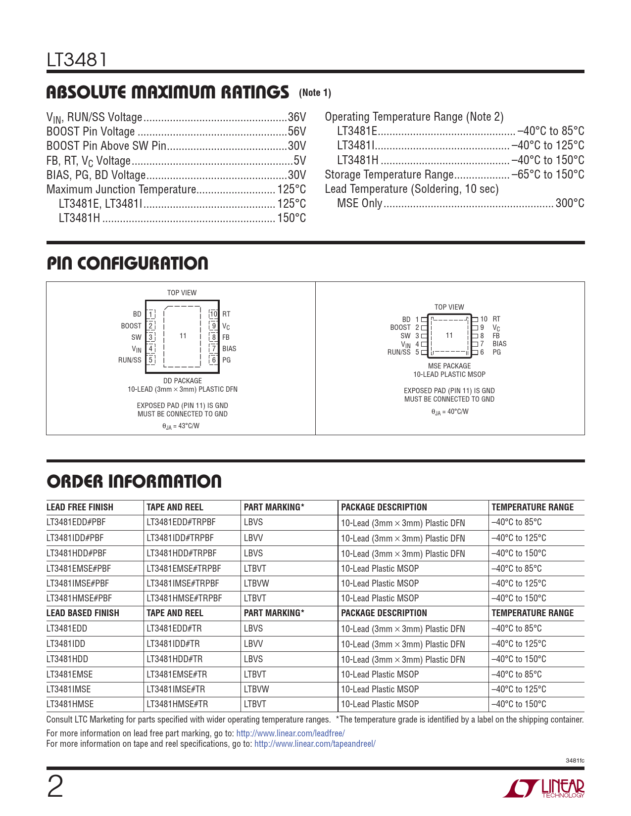 LT3481EDD#PBF LT3481EDD#TRPBF LBVS 10-Lead (3mm × 3mm) Plastic DFN –40°C to 85°C LT3481IDD#PBF LT3481IDD#TRPBF LBVV 10-Lead (3mm × 3mm) Plastic DFN –40°C to 125°C LT3481HDD#PBF LT3481HDD#TRPBF LBVS 10-Lead (3mm × 3mm) Plastic DFN –40°C to 150°C LT3481EMSE#PBF LT3481EMSE#TRPBF LTBVT 10-Lead Plastic MSOP –40°C to 85°C LT3481IMSE#PBF LT3481IMSE#TRPBF LTBVW 10-Lead Plastic MSOP –40°C to 125°C LT3481HMSE#PBF LT3481HMSE#TRPBF LTBVT 10-Lead Plastic MSOP –40°C to 150°C