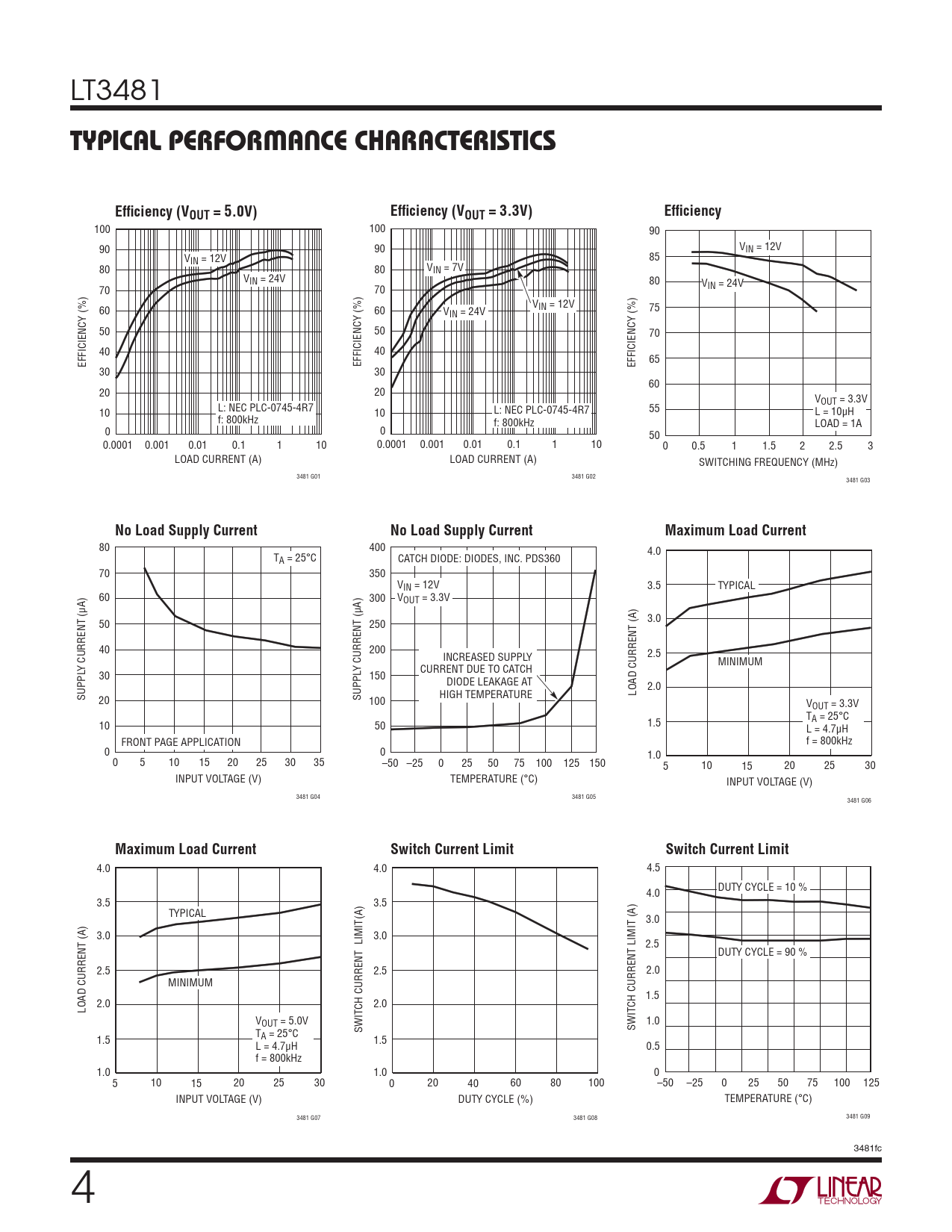 100 100 90 90 90 VIN = 12V VIN = 12V 85 80 80 VIN = 7V VIN = 24V 80 V 70 70 IN = 24V V 60 60 IN = 12V V 75 IN = 24V 50 50 70 40 40 EFFICIENCY (%) EFFICIENCY (%) EFFICIENCY (%) 65 30 30 60 20 20 VOUT = 3.3V L: NEC PLC-0745-4R7 10 10 L: NEC PLC-0745-4R7 55 L = 10μH f: 800kHz f: 800kHz LOAD = 1A 0 0 50 0.0001 0.001 0.01 0.1 1 10 0.0001 0.001 0.01 0.1 1 10 0 0.5 1 1.5 2 2.5 3 LOAD CURRENT (A) LOAD CURRENT (A) SWITCHING FREQUENCY (MHz) 3481 G01 3481 G02 3481 G03