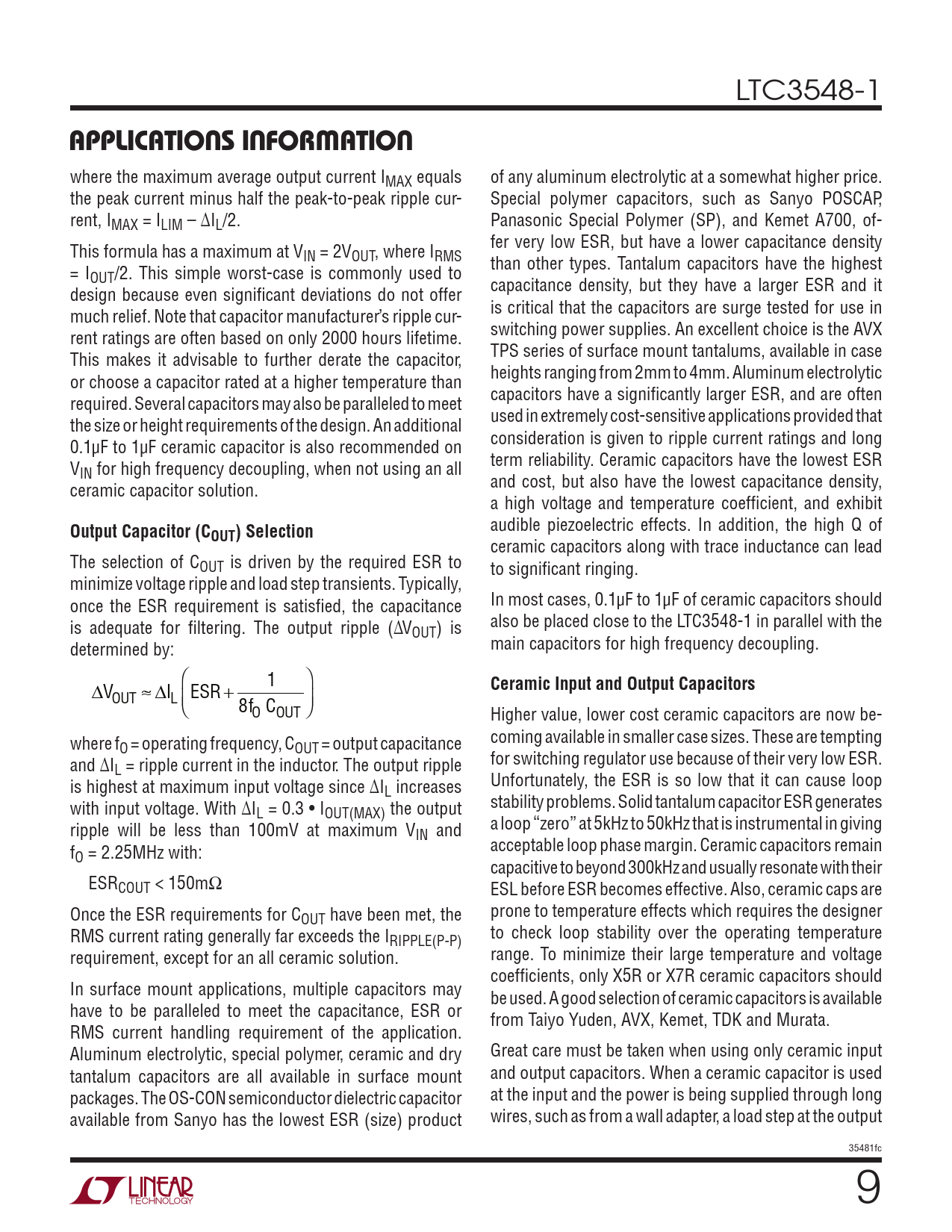 LTC3548-1 APPLICATIONS INFORMATION where the maximum average output current IMAX equals of any aluminum electrolytic at a somewhat higher price. the peak current minus half the peak-to-peak ripple cur- Special polymer capacitors, such as Sanyo POSCAP, rent, IMAX = ILIM – ΔIL/2. Panasonic Special Polymer (SP), and Kemet A700, of- fer very low ESR, but have a lower capacitance density This formula has a maximum at VIN = 2VOUT, where IRMS than other types. Tantalum capacitors have the highest = IOUT/2. This simple worst-case is commonly used to capacitance density, but they have a larger ESR and it design because even signifi cant deviations do not offer is critical that the capacitors are surge tested for use in much relief. Note that capacitor manufacturer’s ripple cur- switching power supplies. An excellent choice is the AVX rent ratings are often based on only 2000 hours lifetime. TPS series of surface mount tantalums, available in case This makes it advisable to further derate the capacitor, heights ranging from 2mm to 4mm. Aluminum electrolytic or choose a capacitor rated at a higher temperature than capacitors have a signifi cantly larger ESR, and are often required. Several capacitors may also be paralleled to meet used in extremely cost-sensitive applications provided that the size or height requirements of the design. An additional consideration is given to ripple current ratings and long 0.1μF to 1μF ceramic capacitor is also recommended on term reliability. Ceramic capacitors have the lowest ESR VIN for high frequency decoupling, when not using an all and cost, but also have the lowest capacitance density, ceramic capacitor solution. a high voltage and temperature coeffi cient, and exhibit Output Capacitor (C audible piezoelectric effects. In addition, the high Q of OUT) Selection ceramic capacitors along with trace inductance can lead The selection of COUT is driven by the required ESR to to signifi cant ringing. minimize voltage ripple and load step transients. Typically, once the ESR requirement is satisfi ed, the capacitance In most cases, 0.1μF to 1μF of ceramic capacitors should is adequate for fi ltering. The output ripple (ΔV also be placed close to the LTC3548-1 in parallel with the OUT) is determined by: main capacitors for high frequency decoupling. V Ceramic Input and Output Capacitors OUT IL ESR + 1 8f O COUT Higher value, lower cost ceramic capacitors are now be- where f coming available in smaller case sizes. These are tempting O = operating frequency, COUT = output capacitance and ΔI for switching regulator use because of their very low ESR. L = ripple current in the inductor. The output ripple is highest at maximum input voltage since ΔI Unfortunately, the ESR is so low that it can cause loop L increases with input voltage. With ΔI stability problems. Solid tantalum capacitor ESR generates L = 0.3 • IOUT(MAX) the output ripple will be less than 100mV at maximum V a loop “zero” at 5kHz to 50kHz that is instrumental in giving IN and f acceptable loop phase margin. Ceramic capacitors remain O = 2.25MHz with: capacitive to beyond 300kHz and usually resonate with their ESRCOUT < 150mΩ ESL before ESR becomes effective. Also, ceramic caps are Once the ESR requirements for C prone to temperature effects which requires the designer OUT have been met, the RMS current rating generally far exceeds the I to check loop stability over the operating temperature RIPPLE(P-P) requirement, except for an all ceramic solution. range. To minimize their large temperature and voltage coeffi cients, only X5R or X7R ceramic capacitors should In surface mount applications, multiple capacitors may be used. A good selection of ceramic capacitors is available have to be paralleled to meet the capacitance, ESR or from Taiyo Yuden, AVX, Kemet, TDK and Murata. RMS current handling requirement of the application. Aluminum electrolytic, special polymer, ceramic and dry Great care must be taken when using only ceramic input tantalum capacitors are all available in surface mount and output capacitors. When a ceramic capacitor is used packages. The OS-CON semiconductor dielectric capacitor at the input and the power is being supplied through long available from Sanyo has the lowest ESR (size) product wires, such as from a wall adapter, a load step at the output 35481fc 9