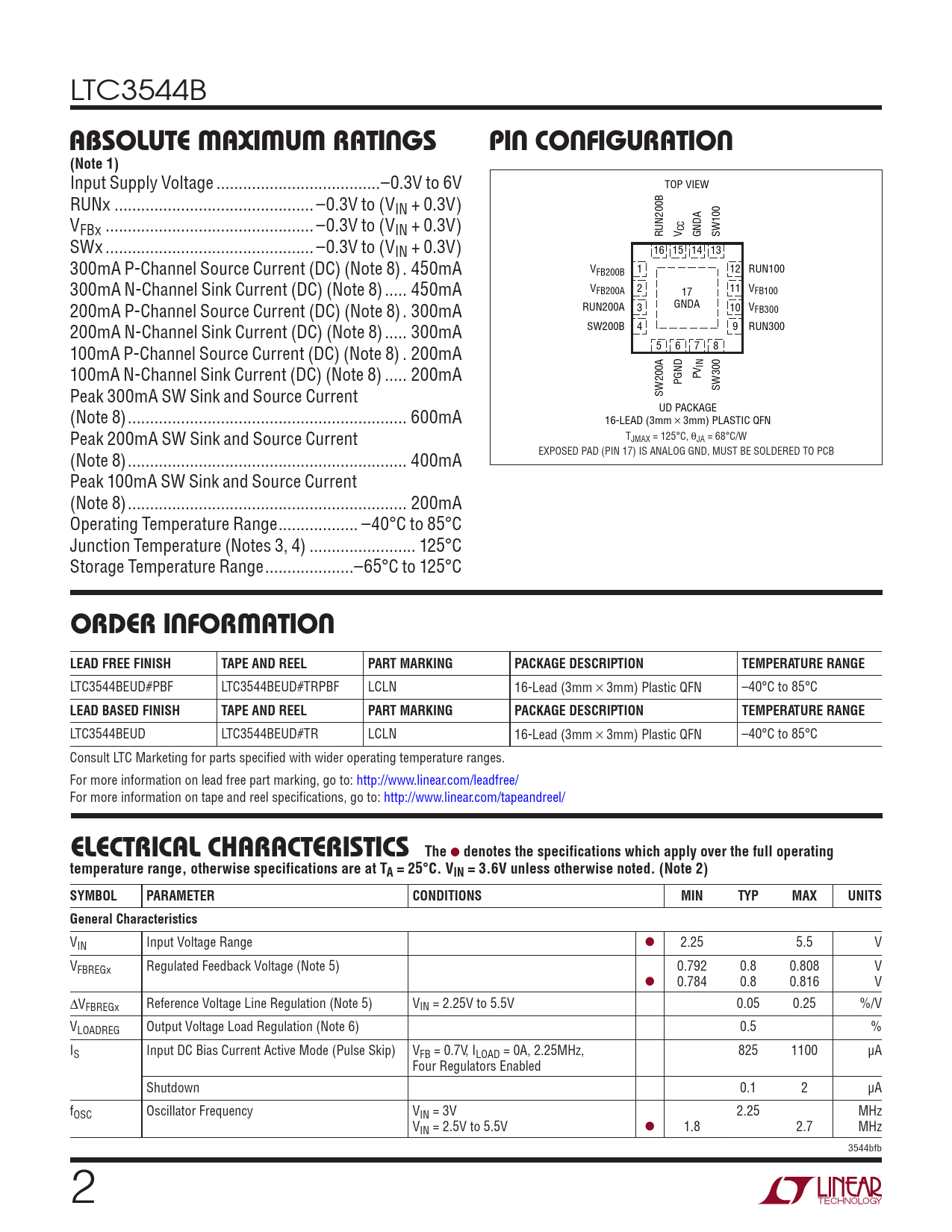 LTC3544BEUD LTC3544BEUD#TR LCLN 16-Lead (3mm × 3mm) Plastic QFN –40°C to 85°C Consult LTC Marketing for parts specified with wider operating temperature ranges. For more information on lead free part marking, go to: http://www.linear.com/leadfree/ For more information on tape and reel specifications, go to: http://www.linear.com/tapeandreel/ e lecTrical characTerisTics