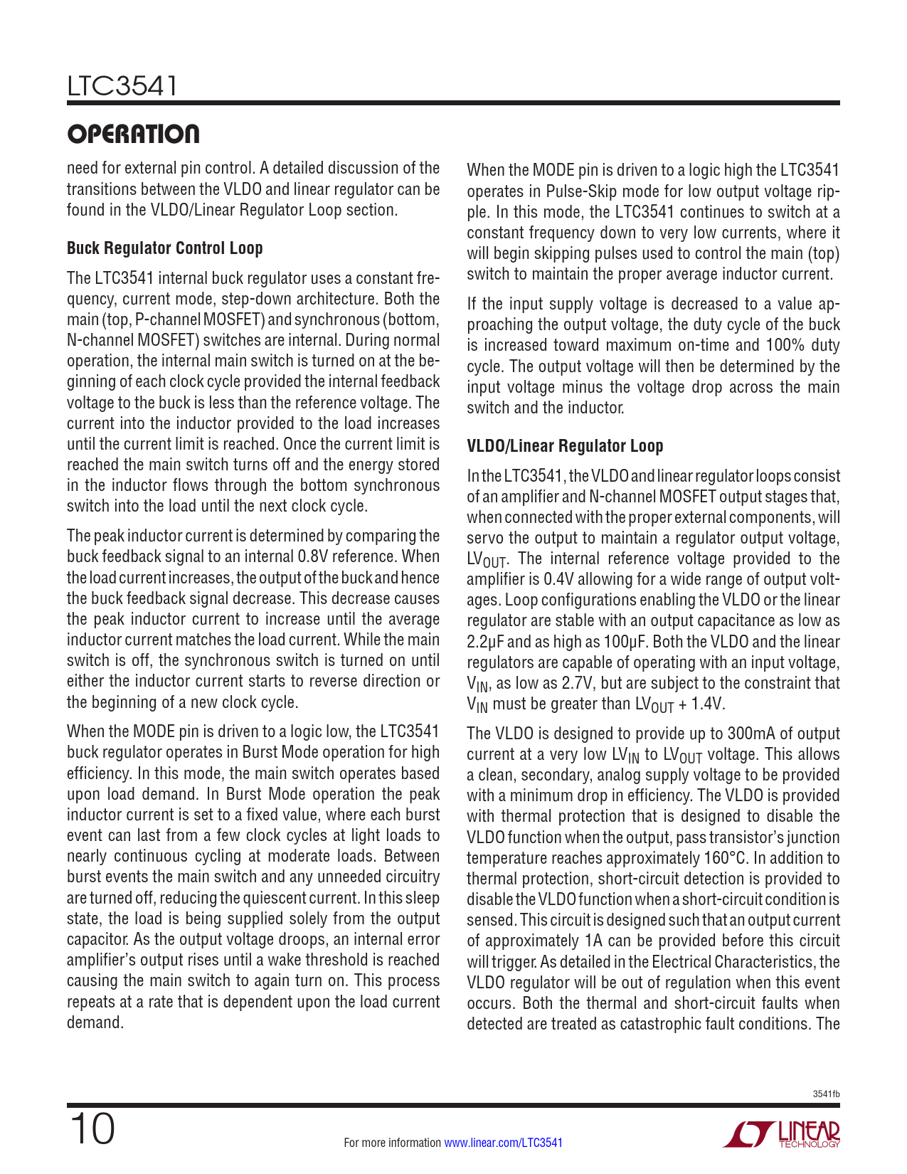 LTC3541 OPERATION need for external pin control. A detailed discussion of the When the MODE pin is driven to a logic high the LTC3541 transitions between the VLDO and linear regulator can be operates in Pulse-Skip mode for low output voltage rip- found in the VLDO/Linear Regulator Loop section. ple. In this mode, the LTC3541 continues to switch at a constant frequency down to very low currents, where it Buck Regulator Control Loop will begin skipping pulses used to control the main (top) The LTC3541 internal buck regulator uses a constant fre- switch to maintain the proper average inductor current. quency, current mode, step-down architecture. Both the If the input supply voltage is decreased to a value ap- main (top, P-channel MOSFET) and synchronous (bottom, proaching the output voltage, the duty cycle of the buck N-channel MOSFET) switches are internal. During normal is increased toward maximum on-time and 100% duty operation, the internal main switch is turned on at the be- cycle. The output voltage will then be determined by the ginning of each clock cycle provided the internal feedback input voltage minus the voltage drop across the main voltage to the buck is less than the reference voltage. The switch and the inductor. current into the inductor provided to the load increases until the current limit is reached. Once the current limit is VLDO/Linear Regulator Loop reached the main switch turns off and the energy stored in the inductor flows through the bottom synchronous In the LTC3541, the VLDO and linear regulator loops consist switch into the load until the next clock cycle. of an amplifier and N-channel MOSFET output stages that, when connected with the proper external components, will The peak inductor current is determined by comparing the servo the output to maintain a regulator output voltage, buck feedback signal to an internal 0.8V reference. When LVOUT. The internal reference voltage provided to the the load current increases, the output of the buck and hence amplifier is 0.4V allowing for a wide range of output volt- the buck feedback signal decrease. This decrease causes ages. Loop configurations enabling the VLDO or the linear the peak inductor current to increase until the average regulator are stable with an output capacitance as low as inductor current matches the load current. While the main 2.2μF and as high as 100μF. Both the VLDO and the linear switch is off, the synchronous switch is turned on until regulators are capable of operating with an input voltage, either the inductor current starts to reverse direction or VIN, as low as 2.7V, but are subject to the constraint that the beginning of a new clock cycle. VIN must be greater than LVOUT + 1.4V. When the MODE pin is driven to a logic low, the LTC3541 The VLDO is designed to provide up to 300mA of output buck regulator operates in Burst Mode operation for high current at a very low LVIN to LVOUT voltage. This allows efficiency. In this mode, the main switch operates based a clean, secondary, analog supply voltage to be provided upon load demand. In Burst Mode operation the peak with a minimum drop in efficiency. The VLDO is provided inductor current is set to a fixed value, where each burst with thermal protection that is designed to disable the event can last from a few clock cycles at light loads to VLDO function when the output, pass transistor’s junction nearly continuous cycling at moderate loads. Between temperature reaches approximately 160°C. In addition to burst events the main switch and any unneeded circuitry thermal protection, short-circuit detection is provided to are turned off, reducing the quiescent current. In this sleep disable the VLDO function when a short-circuit condition is state, the load is being supplied solely from the output sensed. This circuit is designed such that an output current capacitor. As the output voltage droops, an internal error of approximately 1A can be provided before this circuit amplifier’s output rises until a wake threshold is reached will trigger. As detailed in the Electrical Characteristics, the causing the main switch to again turn on. This process VLDO regulator will be out of regulation when this event repeats at a rate that is dependent upon the load current occurs. Both the thermal and short-circuit faults when demand. detected are treated as catastrophic fault conditions. The 3541fb 10 For more information www.linear.com/LTC3541 Document Outline Features Applications Typical Application Description Absolute Maximum Ratings Order Information Pin Configuration Electrical Characteristics Typical Performance Characteristics Pin Functions Block Diagram Operation Applications Information BUCK Regulator VLDO/Linear regulator Applications Information Efficiency Considerations Thermal Considerations Applications Information Pc Board Layout Checklist Design Example Typical Applications Package Description Revision History Related Parts