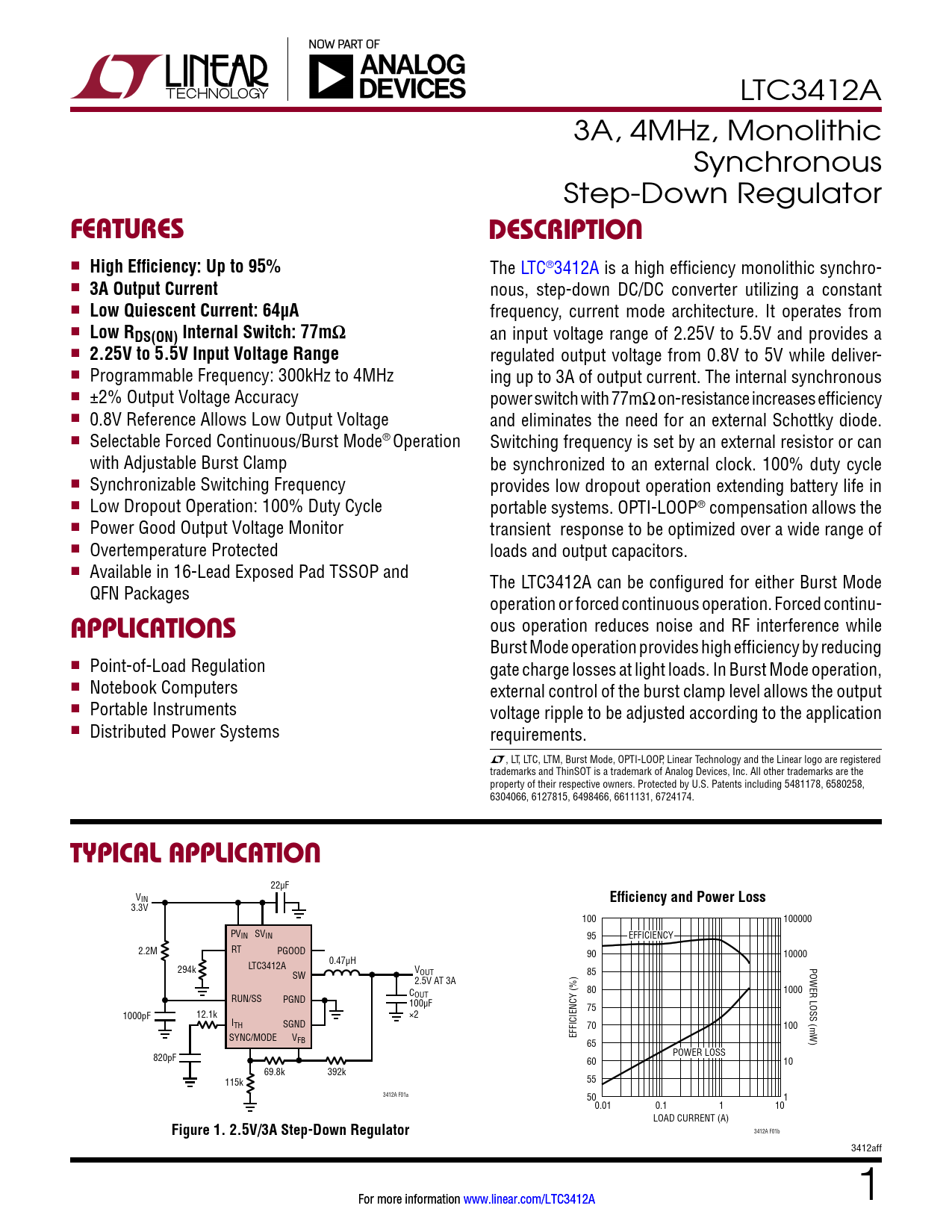 LTC3412A 3A, 4MHz, Monolithic Synchronous Step-Down Regulator FEATURESDESCRIPTION n High Efficiency: Up to 95% The LTC®3412A is a high efficiency monolithic synchro- n 3A Output Current nous, step-down DC/DC converter utilizing a constant n Low Quiescent Current: 64µA frequency, current mode architecture. It operates from n Low RDS(ON) Internal Switch: 77mΩ an input voltage range of 2.25V to 5.5V and provides a n 2.25V to 5.5V Input Voltage Range regulated output voltage from 0.8V to 5V while deliver- n Programmable Frequency: 300kHz to 4MHz ing up to 3A of output current. The internal synchronous n ±2% Output Voltage Accuracy power switch with 77mΩ on-resistance increases efficiency n 0.8V Reference Allows Low Output Voltage and eliminates the need for an external Schottky diode. n Selectable Forced Continuous/Burst Mode® Operation Switching frequency is set by an external resistor or can with Adjustable Burst Clamp be synchronized to an external clock. 100% duty cycle n Synchronizable Switching Frequency provides low dropout operation extending battery life in n Low Dropout Operation: 100% Duty Cycle portable systems. OPTI-LOOP® compensation allows the n Power Good Output Voltage Monitor transient response to be optimized over a wide range of n Overtemperature Protected loads and output capacitors. n Available in 16-Lead Exposed Pad TSSOP and QFN Packages The LTC3412A can be configured for either Burst Mode operation or forced continuous operation. Forced continu- APPLICATIONS ous operation reduces noise and RF interference while Burst Mode operation provides high efficiency by reducing n Point-of-Load Regulation gate charge losses at light loads. In Burst Mode operation, n Notebook Computers external control of the burst clamp level allows the output n Portable Instruments voltage ripple to be adjusted according to the application n Distributed Power Systems requirements. L, LT, LTC, LTM, Burst Mode, OPTI-LOOP, Linear Technology and the Linear logo are registered trademarks and ThinSOT is a trademark of Analog Devices, Inc. All other trademarks are the property of their respective owners. Protected by U.S. Patents including 5481178, 6580258, 6304066, 6127815, 6498466, 6611131, 6724174. TYPICAL APPLICATION 22µF VIN Efficiency and Power Loss 3.3V 100 100000 PVIN SVIN 95 EFFICIENCY 2.2M RT PGOOD 90 10000 LTC3412A 0.47µH 294k POWER LOSS (mW) SW VOUT 85 2.5V AT 3A C 80 1000 RUN/SS PGND OUT 100µF 75 1000pF 12.1k ×2 ITH SGND 70 100 SYNC/MODE V EFFICIENCY (%) FB 65 820pF POWER LOSS 60 10 69.8k 392k 115k 55 3412A F01a 50 1 0.01 0.1 1 10 LOAD CURRENT (A) Figure 1. 2.5V/3A Step-Down Regulator 3412A F01b 3412aff Fo F r o rmo m r o e r e inf n o f r o m r a m t a iton o n ww w w w . w line n a e r a .rco c m o / m L / T L C T 3 C 41 3 2 41 A 2 1 Document Outline Features Applications Description Typical Application Absolute Maximum Ratings Pin Configuration Order Information Electrical Characteristics Typical Performance Characteristics Pin Functions Block Diagram Operation Applications Information Typical Applications Package Description Revision History Related Parts