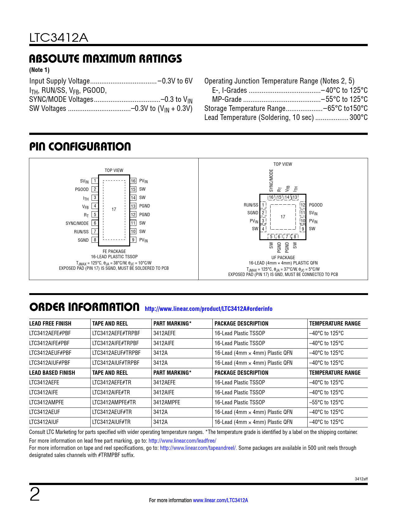 LTC3412A ABSOLUTE MAXIMUM RATINGS(Note 1) Input Supply Voltage .. –0.3V to 6V Operating Junction Temperature Range (Notes 2, 5) ITH, RUN/SS, VFB, PGOOD, E-, I-Grades ...–40°C to 125°C SYNC/MODE Voltages ..–0.3 to VIN MP-Grade ..–55°C to 125°C SW Voltages ..–0.3V to (VIN + 0.3V) Storage Temperature Range ..–65°C to150°C Lead Temperature (Soldering, 10 sec) .. 300°C PIN CONFIGURATION TOP VIEW TOP VIEW SV 1 16 IN PVIN PGOOD 2 15 SW SYNC/MODE R T V FB I TH I 3 14 TH SW 16 15 14 13 V 4 13 RUN/SS 1 12 PGOOD FB PGND 17 R 5 12 SGND 2 11 SV T PGND IN 17 SYNC/MODE 6 11 SW PVIN 3 10 PVIN SW 4 9 SW RUN/SS 7 10 SW 5 6 7 8 SGND 8 9 PVIN SW SW FE PACKAGE PGND PGND 16-LEAD PLASTIC TSSOP UF PACKAGE TJMAX = 125°C, θJA = 38°C/W, θJC = 10°C/W 16-LEAD (4mm × 4mm) PLASTIC QFN EXPOSED PAD (PIN 17) IS SGND, MUST BE SOLDERED TO PCB TJMAX = 125°C, θJA = 37°C/W, θJC = 5°C/W EXPOSED PAD (PIN 17) IS GND, MUST BE CONNECTED TO PCB ORDER INFORMATION http://www.linear.com/product/LTC3412A#orderinfoLEAD FREE FINISHTAPE AND REELPART MARKING*PACKAGE DESCRIPTIONTEMPERATURE RANGE LTC3412AEFE#PBF LTC3412AEFE#TRPBF 3412AEFE 16-Lead Plastic TSSOP –40°C to 125°C LTC3412AIFE#PBF LTC3412AIFE#TRPBF 3412AIFE 16-Lead Plastic TSSOP –40°C to 125°C LTC3412AEUF#PBF LTC3412AEUF#TRPBF 3412A 16-Lead (4mm × 4mm) Plastic QFN –40°C to 125°C LTC3412AIUF#PBF LTC3412AIUF#TRPBF 3412A 16-Lead (4mm × 4mm) Plastic QFN –40°C to 125°C LEAD BASED FINISHTAPE AND REELPART MARKING*PACKAGE DESCRIPTIONTEMPERATURE RANGE LTC3412AEFE LTC3412AEFE#TR 3412AEFE 16-Lead Plastic TSSOP –40°C to 125°C LTC3412AIFE LTC3412AIFE#TR 3412AIFE 16-Lead Plastic TSSOP –40°C to 125°C LTC3412AMPFE LTC3412AMPFE#TR 3412AMPFE 16-Lead Plastic TSSOP –55°C to 125°C LTC3412AEUF LTC3412AEUF#TR 3412A 16-Lead (4mm × 4mm) Plastic QFN –40°C to 125°C LTC3412AIUF LTC3412AIUF#TR 3412A 16-Lead (4mm × 4mm) Plastic QFN –40°C to 125°C Consult LTC Marketing for parts specified with wider operating temperature ranges. *The temperature grade is identified by a label on the shipping container. For more information on lead free part marking, go to: http://www.linear.com/leadfree/ For more information on tape and reel specifications, go to: http://www.linear.com/tapeandreel/. Some packages are available in 500 unit reels through designated sales channels with #TRMPBF suffix. 3412aff 2 Fo F r o rmo m r o e r e inf n o f r o m r a m t a iton o n ww w w w . w line n a e r a .rco c m o / m L / T L C T 3 C 4 3 1 4 2 1 A 2 Document Outline Features Applications Description Typical Application Absolute Maximum Ratings Pin Configuration Order Information Electrical Characteristics Typical Performance Characteristics Pin Functions Block Diagram Operation Applications Information Typical Applications Package Description Revision History Related Parts