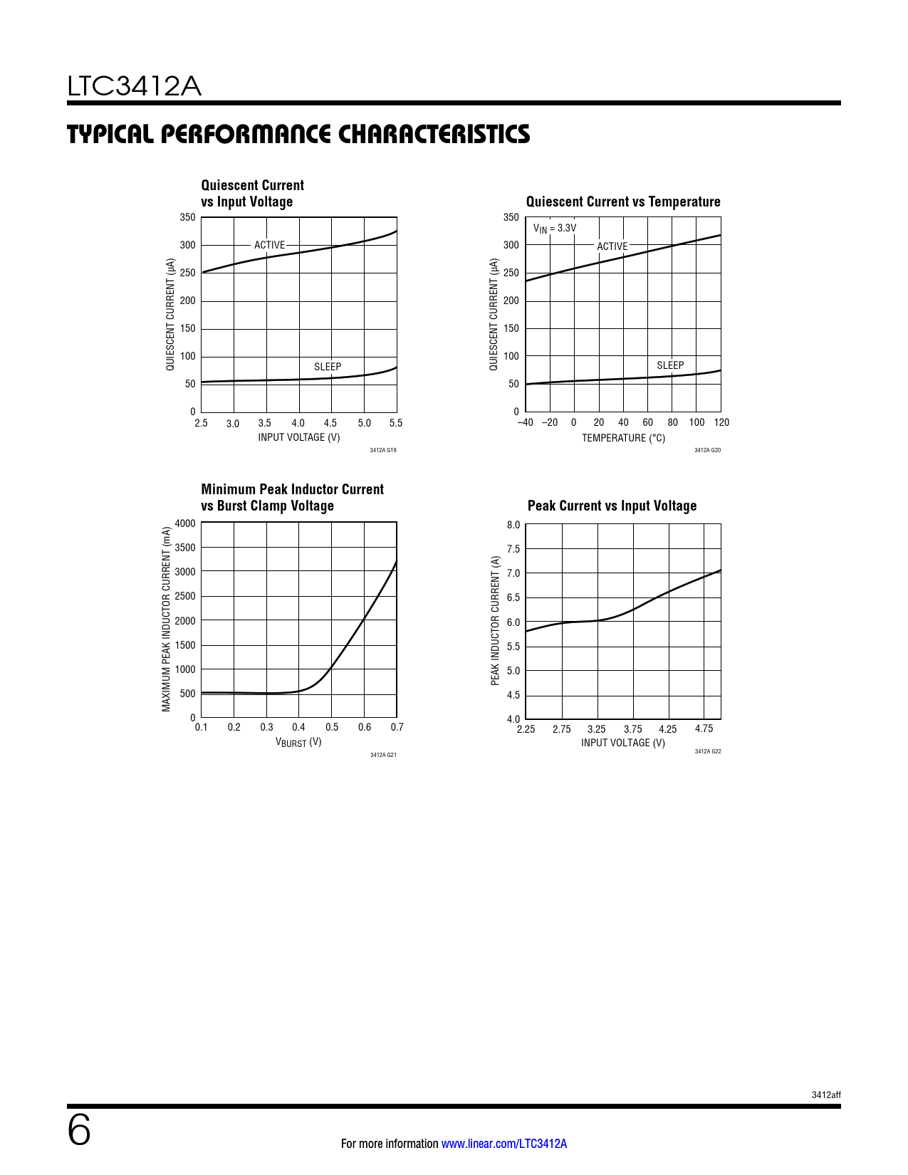 LTC3412A TYPICAL PERFORMANCE CHARACTERISTICSQuiescent Currentvs Input VoltageQuiescent Current vs Temperature 350 350 VIN = 3.3V 300 ACTIVE 300 ACTIVE 250 250 200 200 150 150 100 100 QUIESCENT CURRENT (µA) SLEEP QUIESCENT CURRENT (µA) SLEEP 50 50 0 0 2.5 3.0 3.5 4.0 4.5 5.0 5.5 –40 –20 0 20 40 60 80 100 120 INPUT VOLTAGE (V) TEMPERATURE (°C) 3412A G19 3412A G20 Minimum Peak Inductor Currentvs Burst Clamp VoltagePeak Current vs Input Voltage 4000 8.0 3500 7.5 3000 7.0 2500 6.5 2000 6.0 1500 5.5 1000 5.0 PEAK INDUCTOR CURRENT (A) 500 4.5 MAXIMUM PEAK INDUCTOR CURRENT (mA) 0 4.0 0.1 0.2 0.3 0.4 0.5 0.6 0.7 2.25 2.75 3.25 3.75 4.25 4.75 VBURST (V) INPUT VOLTAGE (V) 3412A G22 3412A G21 3412aff 6 Fo F r o rmo m r o e r e inf n o f r o m r a m t a iton o n ww w w w . w line n a e r a .rco c m o / m L / T L C T 3 C 4 3 1 4 2 1 A 2 Document Outline Features Applications Description Typical Application Absolute Maximum Ratings Pin Configuration Order Information Electrical Characteristics Typical Performance Characteristics Pin Functions Block Diagram Operation Applications Information Typical Applications Package Description Revision History Related Parts