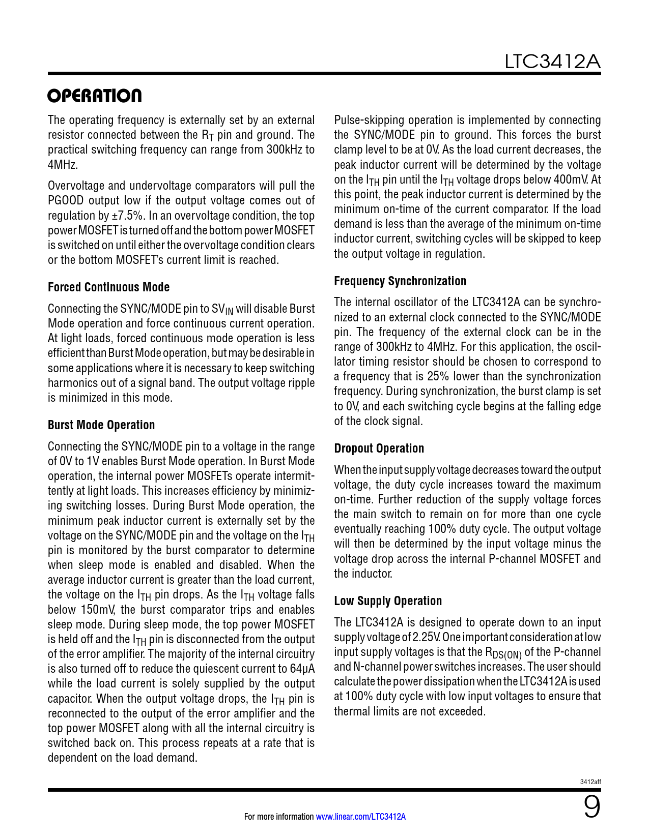 OPERATION Forced Continuous Mode Frequency Synchronization Burst Mode Operation Dropout Operation Low Supply Operation