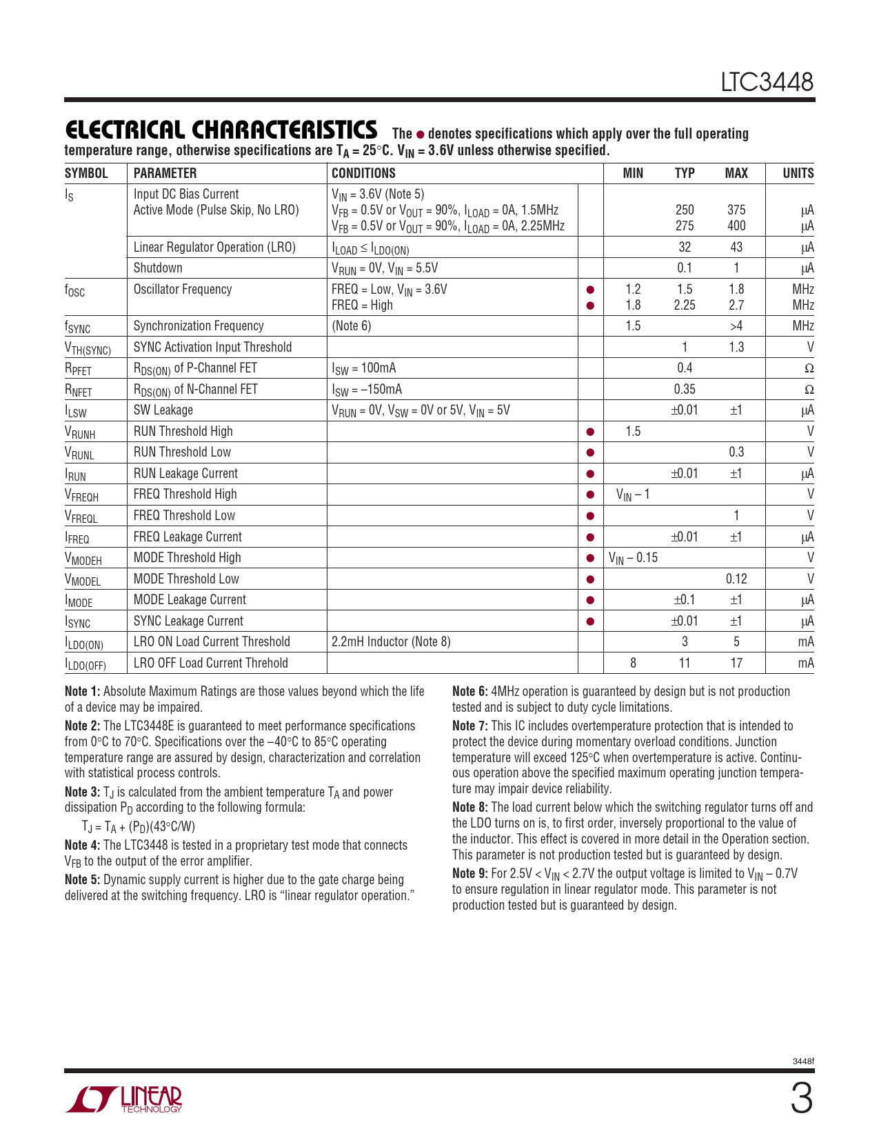 IS Input DC Bias Current VIN = 3.6V (Note 5) Active Mode (Pulse Skip, No LRO) VFB = 0.5V or VOUT = 90%, ILOAD = 0A, 1.5MHz 250 375 µA VFB = 0.5V or VOUT = 90%, ILOAD = 0A, 2.25MHz 275 400 µA Linear Regulator Operation (LRO) ILOAD ≤ ILDO(ON) 32 43 µA Shutdown VRUN = 0V, VIN = 5.5V 0.1 1 µA fOSC Oscillator Frequency FREQ = Low, VIN = 3.6V ● 1.2 1.5 1.8 MHz FREQ = High ● 1.8 2.25 2.7 MHz fSYNC Synchronization Frequency (Note 6) 1.5 >4 MHz VTH(SYNC) SYNC Activation Input Threshold 1 1.3 V RPFET RDS(ON) of P-Channel FET ISW = 100mA 0.4 Ω RNFET RDS(ON) of N-Channel FET ISW = –150mA 0.35 Ω ILSW SW Leakage VRUN = 0V, VSW = 0V or 5V, VIN = 5V ±0.01 ±1 µA VRUNH RUN Threshold High ● 1.5 V VRUNL RUN Threshold Low ● 0.3 V IRUN RUN Leakage Current ● ±0.01 ±1 µA VFREQH FREQ Threshold High ● VIN – 1 V VFREQL FREQ Threshold Low ● 1 V IFREQ FREQ Leakage Current ● ±0.01 ±1 µA VMODEH MODE Threshold High ● VIN – 0.15 V VMODEL MODE Threshold Low ● 0.12 V IMODE MODE Leakage Current ● ±0.1 ±1 µA ISYNC SYNC Leakage Current ● ±0.01 ±1 µA ILDO(ON) LRO ON Load Current Threshold 2.2mH Inductor (Note 8) 3 5 mA ILDO(OFF) LRO OFF Load Current Threhold 8 11 17 mA