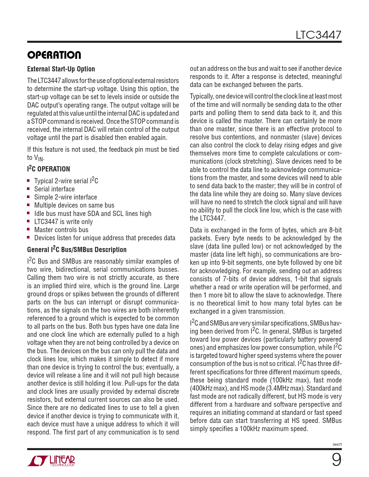 LTC3447 UOPERATIOExternal Start-Up Option out an address on the bus and wait to see if another device responds to it. After a response is detected, meaningful The LTC3447 allows for the use of optional external resistors data can be exchanged between the parts. to determine the start-up voltage. Using this option, the start-up voltage can be set to levels inside or outside the Typically, one device will control the clock line at least most DAC output’s operating range. The output voltage will be of the time and will normally be sending data to the other regulated at this value until the internal DAC is updated and parts and polling them to send data back to it, and this a STOP command is received. Once the STOP command is device is called the master. There can certainly be more received, the internal DAC will retain control of the output than one master, since there is an effective protocol to voltage until the part is disabled then enabled again. resolve bus contentions, and nonmaster (slave) devices can also control the clock to delay rising edges and give If this feature is not used, the feedback pin must be tied themselves more time to complete calculations or com- to VIN. munications (clock stretching). Slave devices need to be I2C OPERATION able to control the data line to acknowledge communica- tions from the master, and some devices will need to able n Typical 2-wire serial I2C to send data back to the master; they will be in control of n Serial interface the data line while they are doing so. Many slave devices n Simple 2-wire interface will have no need to stretch the clock signal and will have n Multiple devices on same bus no ability to pull the clock line low, which is the case with n Idle bus must have SDA and SCL lines high the LTC3447. n LTC3447 is write only n Master controls bus Data is exchanged in the form of bytes, which are 8-bit n Devices listen for unique address that precedes data packets. Every byte needs to be acknowledged by the General I2C Bus/SMBus Description slave (data line pulled low) or not acknowledged by the master (data line left high), so communications are bro- I2C Bus and SMBus are reasonably similar examples of ken up into 9-bit segments, one byte followed by one bit two wire, bidirectional, serial communications busses. for acknowledging. For example, sending out an address Calling them two wire is not strictly accurate, as there consists of 7-bits of device address, 1-bit that signals is an implied third wire, which is the ground line. Large whether a read or write operation will be performed, and ground drops or spikes between the grounds of different then 1 more bit to allow the slave to acknowledge. There parts on the bus can interrupt or disrupt communica- is no theoretical limit to how many total bytes can be tions, as the signals on the two wires are both inherently exchanged in a given transmission. referenced to a ground which is expected to be common to all parts on the bus. Both bus types have one data line I2C and SMBus are very similar specifi cations, SMBus hav- and one clock line which are externally pulled to a high ing been derived from I2C. In general, SMBus is targeted voltage when they are not being controlled by a device on toward low power devices (particularly battery powered the bus. The devices on the bus can only pull the data and ones) and emphasizes low power consumption, while I2C clock lines low, which makes it simple to detect if more is targeted toward higher speed systems where the power than one device is trying to control the bus; eventually, a consumption of the bus is not so critical. I2C has three dif- device will release a line and it will not pull high because ferent specifi cations for three different maximum speeds, another device is still holding it low. Pull-ups for the data these being standard mode (100kHz max), fast mode and clock lines are usually provided by external discrete (400kHz max), and HS mode (3.4MHz max). Standard and resistors, but external current sources can also be used. fast mode are not radically different, but HS mode is very Since there are no dedicated lines to use to tell a given different from a hardware and software perspective and device if another device is trying to communicate with it, requires an initiating command at standard or fast speed each device must have a unique address to which it will before data can start transferring at HS speed. SMBus respond. The fi rst part of any communication is to send simply specifi es a 100kHz maximum speed. 3447f 9