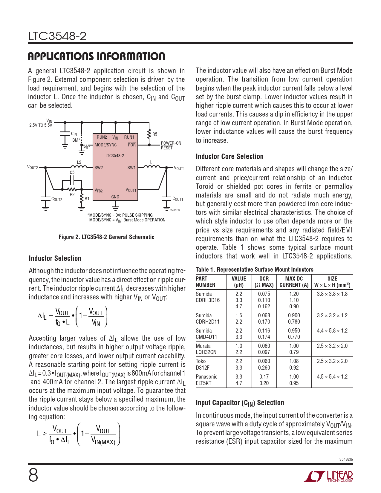 LTC3548-2 APPLICATIONS INFORMATION A general LTC3548-2 application circuit is shown in The inductor value will also have an effect on Burst Mode Figure 2. External component selection is driven by the operation. The transition from low current operation load requirement, and begins with the selection of the begins when the peak inductor current falls below a level inductor L. Once the inductor is chosen, CIN and COUT set by the burst clamp. Lower inductor values result in can be selected. higher ripple current which causes this to occur at lower load currents. This causes a dip in effi ciency in the upper VIN range of low current operation. In Burst Mode operation, 2.5V TO 5.5V C lower inductance values will cause the burst frequency IN R5 RUN2 VIN RUN1 BM* to increase. MODE/SYNC POR POWER-ON PS* RESET LTC3548-2 Inductor Core Selection L2 L1 VOUT2 SW2 SW1 VOUT1 Different core materials and shapes will change the size/ C5 current and price/current relationship of an inductor. Toroid or shielded pot cores in ferrite or permalloy V V FB2 OUT1 R2 GND materials are small and do not radiate much energy, C R1 OUT2 COUT1 but generally cost more than powdered iron core induc- 35482 F02 tors with similar electrical characteristics. The choice of *MODE/SYNC = 0V: PULSE SKIPPING MODE/SYNC = VIN: Burst Mode OPERATION which style inductor to use often depends more on the price vs size requirements and any radiated fi eld/EMI Figure 2. LTC3548-2 General Schematic requirements than on what the LTC3548-2 requires to operate. Table 1 shows some typical surface mount inductors that work well in LTC3548-2 applications. Inductor SelectionTable 1. Representative Surface Mount Inductors Although the inductor does not infl uence the operating fre- PARTVALUEDCRMAX DCSIZE quency, the inductor value has a direct effect on ripple cur- NUMBER(μH)( Ω MAX)CURRENT (A)W × L × H (mm3) rent. The inductor ripple current ΔIL decreases with higher Sumida 2.2 0.075 1.20 3.8 × 3.8 × 1.8 inductance and increases with higher VIN or VOUT: CDRH3D16 3.3 0.110 1.10 4.7 0.162 0.90 V ⎛ V ⎞ I OUT OUT • 1– Sumida 1.5 0.068 0.900 3.2 × 3.2 × 1.2 Δ L = CDRH2D11 2.2 0.170 0.780 f • L O ⎝⎜ VIN ⎠⎟ Sumida 2.2 0.116 0.950 4.4 × 5.8 × 1.2 CMD4D11 3.3 0.174 0.770 Accepting larger values of ΔIL allows the use of low Murata 1.0 0.060 1.00 2.5 × 3.2 × 2.0 inductances, but results in higher output voltage ripple, LQH32CN 2.2 0.097 0.79 greater core losses, and lower output current capability. Toko 2.2 0.060 1.08 2.5 × 3.2 × 2.0 A reasonable starting point for setting ripple current is D312F 3.3 0.260 0.92 ΔIL = 0.3 • IOUT(MAX), where IOUT(MAX) is 800mA for channel 1 Panasonic 3.3 0.17 1.00 4.5 × 5.4 × 1.2 and 400mA for channel 2. The largest ripple current ΔIL ELT5KT 4.7 0.20 0.95 occurs at the maximum input voltage. To guarantee that the ripple current stays below a specifi ed maximum, the Input Capacitor (CIN) Selection inductor value should be chosen according to the follow- In continuous mode, the input current of the converter is a ing equation: square wave with a duty cycle of approximately VOUT/VIN. V ⎛ V ⎞ L OUT OUT • 1– To prevent large voltage transients, a low equivalent series ≥ ⎜ ⎟ f • ΔI V O L ⎝ IN MA ( X) ⎠ resistance (ESR) input capacitor sized for the maximum 35482fb 8
