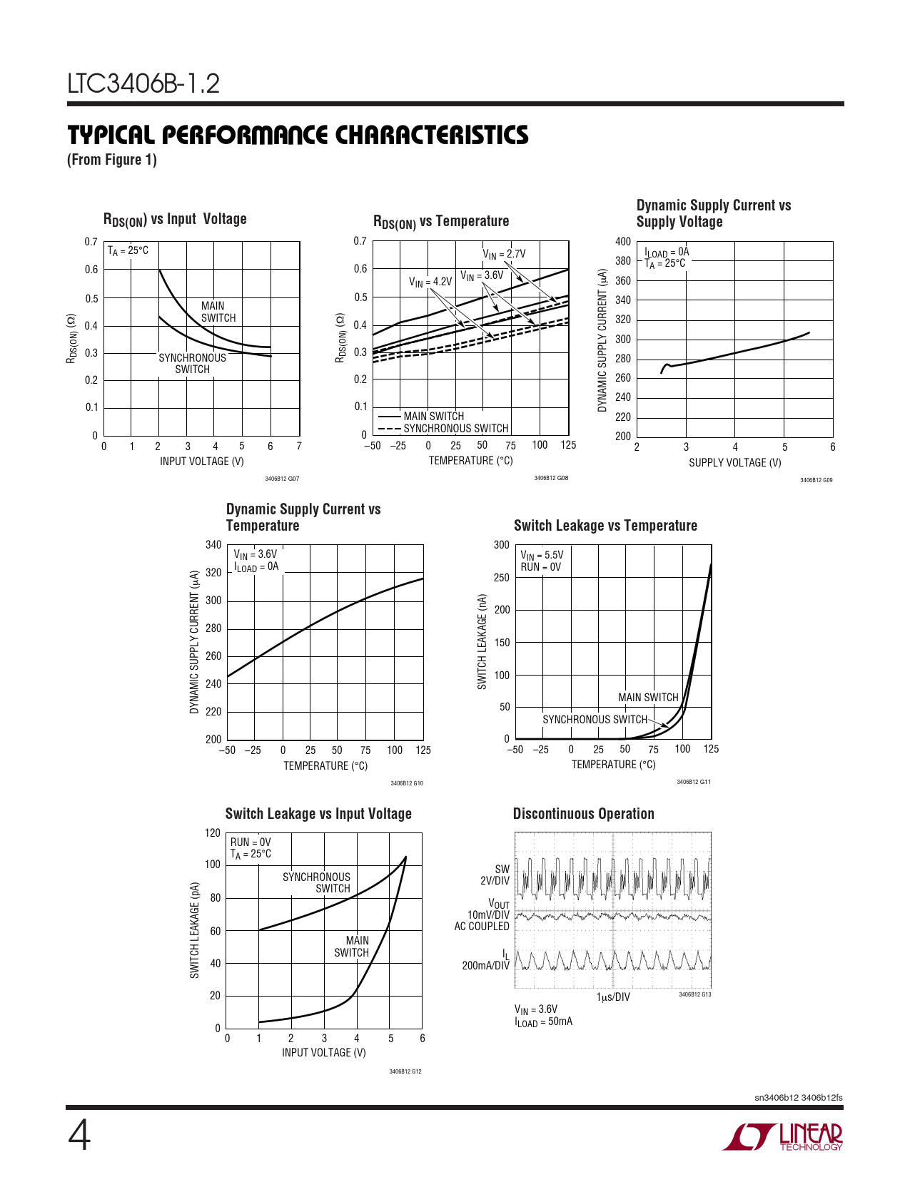 0.7 0.7 400 TA = 25°C V I IN = 2.7V LOAD = 0A 380 T 0.6 0.6 A = 25°C VIN = 3.6V A) VIN = 4.2V µ 360 0.5 0.5 340 MAIN ) Ω SWITCH Ω 320 ( 0.4 ( 0.4 300 DS(ON) 0.3 DS(ON) 0.3 R SYNCHRONOUS R 280 SWITCH 0.2 0.2 260 240 0.1 0.1 DYNAMIC SUPPLY CURRENT ( MAIN SWITCH 220 SYNCHRONOUS SWITCH 0 0 200 0 1 2 3 4 5 6 7 –50 –25 0 25 50 75 100 125 2 3 4 5 6 INPUT VOLTAGE (V) TEMPERATURE (°C) SUPPLY VOLTAGE (V) 3406B12 G07 3406B12 G08 3406B12 G09