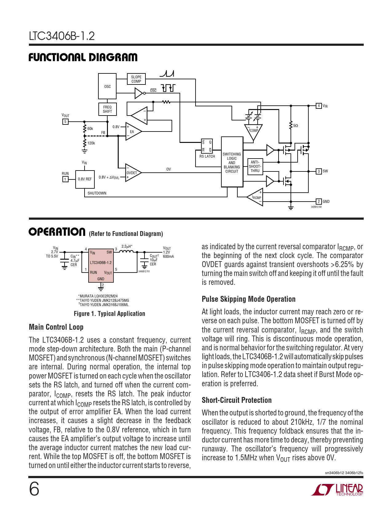 COMP resets the RS latch, is controlled by the output of error amplifier EA. When the load current When the output is shorted to ground, the frequency of the increases, it causes a slight decrease in the feedback oscillator is reduced to about 210kHz, 1/7 the nominal voltage, FB, relative to the 0.8V reference, which in turn frequency. This frequency foldback ensures that the in- causes the EA amplifier’s output voltage to increase until ductor current has more time to decay, thereby preventing the average inductor current matches the new load cur- runaway. The oscillator’s frequency will progressively rent. While the top MOSFET is off, the bottom MOSFET is increase to 1.5MHz when VOUT rises above 0V. turned on until either the inductor current starts to reverse, sn3406b12 3406b12fs 6