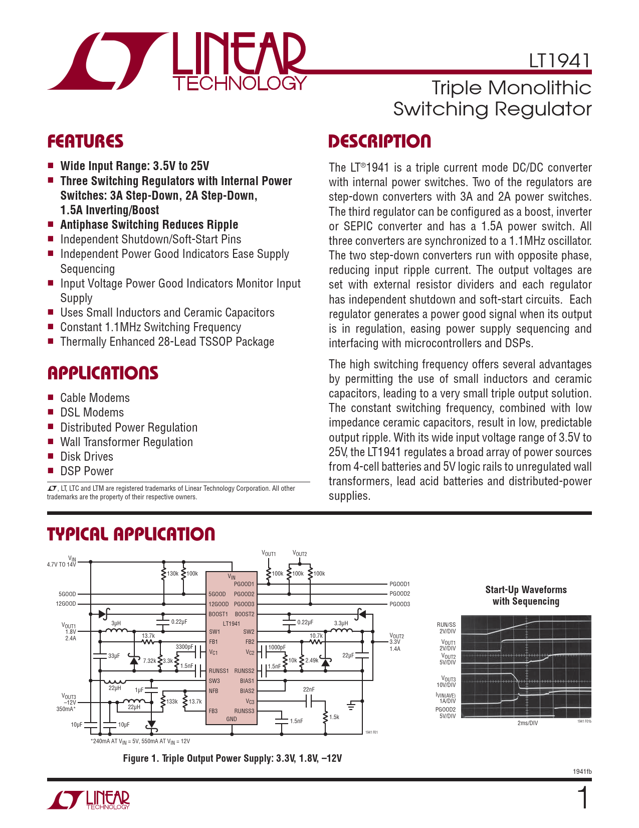 BOOST1 BOOST2 0.22μF V 3μH LT1941 0.22μF 3.3μH OUT1 RUN/SS 1.8V SW1 SW2 2V/DIV V 2.4A 13.7k 10.7k OUT2 FB1 FB2 3.3V VOUT1 3300pF 1000pF 1.4A 2V/DIV V V 33μF C1 C2 22μF VOUT2 7.32k 3.3k 10k 2.49k 5V/DIV 1.5nF 1.5nF RUNSS1 RUNSS2 SW3 BIAS1 VOUT3 10V/DIV 22μH 1μF 22nF NFB BIAS2 V I OUT3 VIN(AVE) –12V 133k 13.7k VC3 1A/DIV 350mA* 22μH FB3 RUNSS3 PGOOD2 5V/DIV GND 1.5k 1.5nF 1941 F01b 10μF 10μF 2ms/DIV 1941 F01 *240mA AT VIN = 5V, 550mA AT VIN = 12V