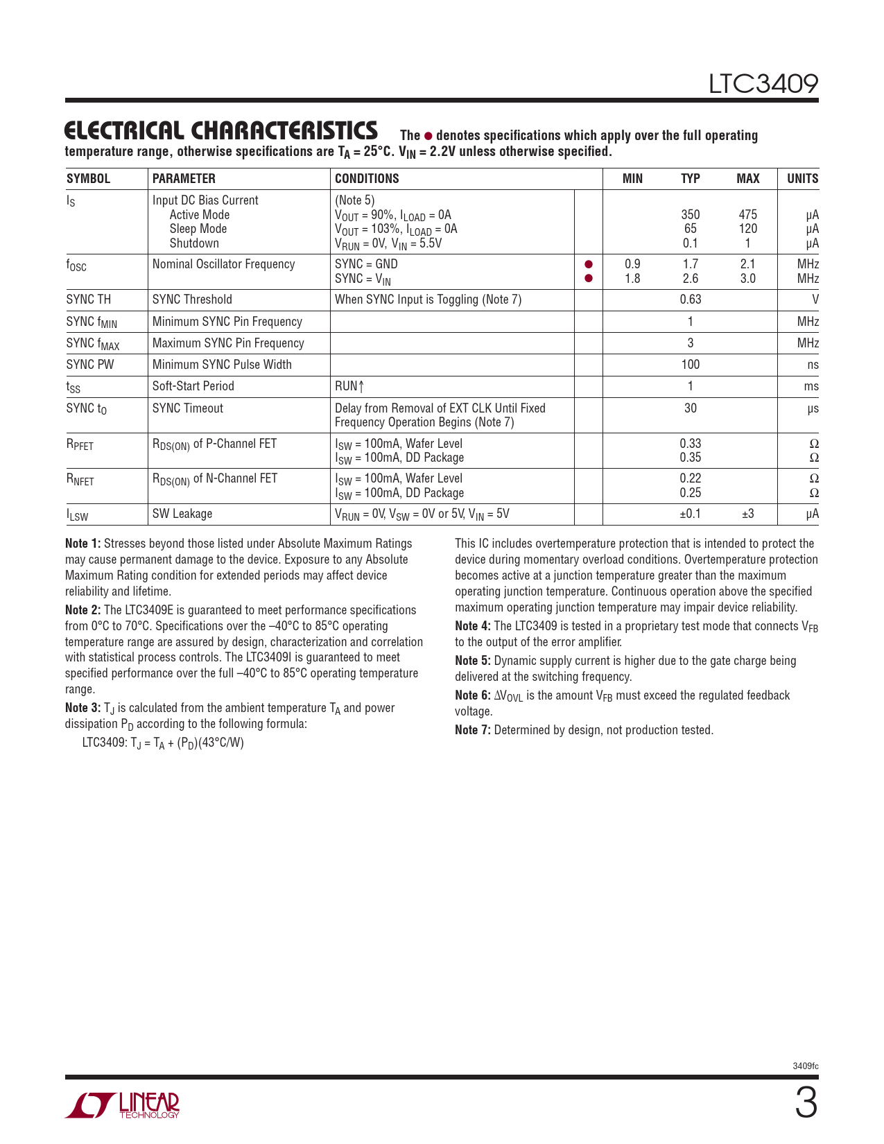 LTC3409 TheELECTRICAL CHARACTERISTICS ● denotes specifi cations which apply over the full operatingtemperature range, otherwise specifi cations are TA = 25°C. VIN = 2.2V unless otherwise specifi ed.SYMBOLPARAMETERCONDITIONSMINTYPMAXUNITS IS Input DC Bias Current (Note 5) Active Mode VOUT = 90%, ILOAD = 0A 350 475 μA Sleep Mode VOUT = 103%, ILOAD = 0A 65 120 μA Shutdown VRUN = 0V, VIN = 5.5V 0.1 1 μA fOSC Nominal Oscillator Frequency SYNC = GND ● 0.9 1.7 2.1 MHz SYNC = VIN ● 1.8 2.6 3.0 MHz SYNC TH SYNC Threshold When SYNC Input is Toggling (Note 7) 0.63 V SYNC fMIN Minimum SYNC Pin Frequency 1 MHz SYNC fMAX Maximum SYNC Pin Frequency 3 MHz SYNC PW Minimum SYNC Pulse Width 100 ns tSS Soft-Start Period RUN↑ 1 ms SYNC tO SYNC Timeout Delay from Removal of EXT CLK Until Fixed 30 μs Frequency Operation Begins (Note 7) RPFET RDS(ON) of P-Channel FET ISW = 100mA, Wafer Level 0.33 Ω ISW = 100mA, DD Package 0.35 Ω RNFET RDS(ON) of N-Channel FET ISW = 100mA, Wafer Level 0.22 Ω ISW = 100mA, DD Package 0.25 Ω ILSW SW Leakage VRUN = 0V, VSW = 0V or 5V, VIN = 5V ±0.1 ±3 μA Note 1: Stresses beyond those listed under Absolute Maximum Ratings This IC includes overtemperature protection that is intended to protect the may cause permanent damage to the device. Exposure to any Absolute device during momentary overload conditions. Overtemperature protection Maximum Rating condition for extended periods may affect device becomes active at a junction temperature greater than the maximum reliability and lifetime. operating junction temperature. Continuous operation above the specifi ed Note 2: The LTC3409E is guaranteed to meet performance specifi cations maximum operating junction temperature may impair device reliability. from 0°C to 70°C. Specifi cations over the –40°C to 85°C operating Note 4: The LTC3409 is tested in a proprietary test mode that connects VFB temperature range are assured by design, characterization and correlation to the output of the error amplifi er. with statistical process controls. The LTC3409I is guaranteed to meet Note 5: Dynamic supply current is higher due to the gate charge being specifi ed performance over the full –40°C to 85°C operating temperature delivered at the switching frequency. range. Note 6: ΔVOVL is the amount VFB must exceed the regulated feedback Note 3: TJ is calculated from the ambient temperature TA and power voltage. dissipation PD according to the following formula: Note 7: Determined by design, not production tested. LTC3409: TJ = TA + (PD)(43°C/W) 3409fc 3