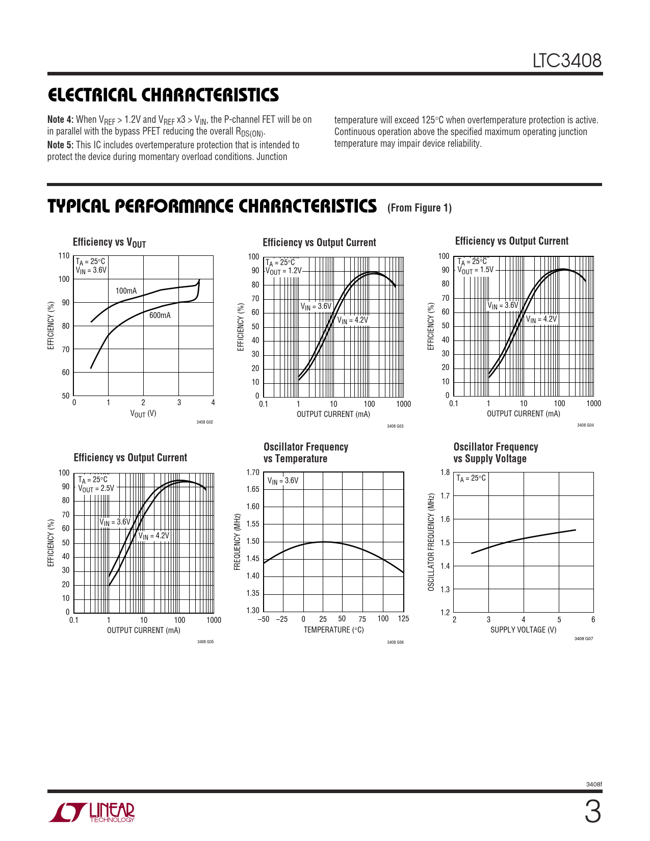 100 1.70 1.8 T T A = 25°C VIN = 3.6V A = 25°C 90 VOUT = 2.5V 1.65 1.7 80 1.60 70 V 1.6 IN = 3.6V 1.55 60 VIN = 4.2V 50 1.50 1.5 40 1.45 EFFICIENCY (%) 1.4 30 FREQUENCY (MHz) 1.40 20 OSCILLATOR FREQUENCY (MHz) 1.3 1.35 10 0 1.30 1.2 0.1 1 10 100 1000 –50 –25 0 25 50 75 100 125 2 3 4 5 6 OUTPUT CURRENT (mA) TEMPERATURE (°C) SUPPLY VOLTAGE (V) 3408 G07 3408 G05 3408 G06 3408f 3