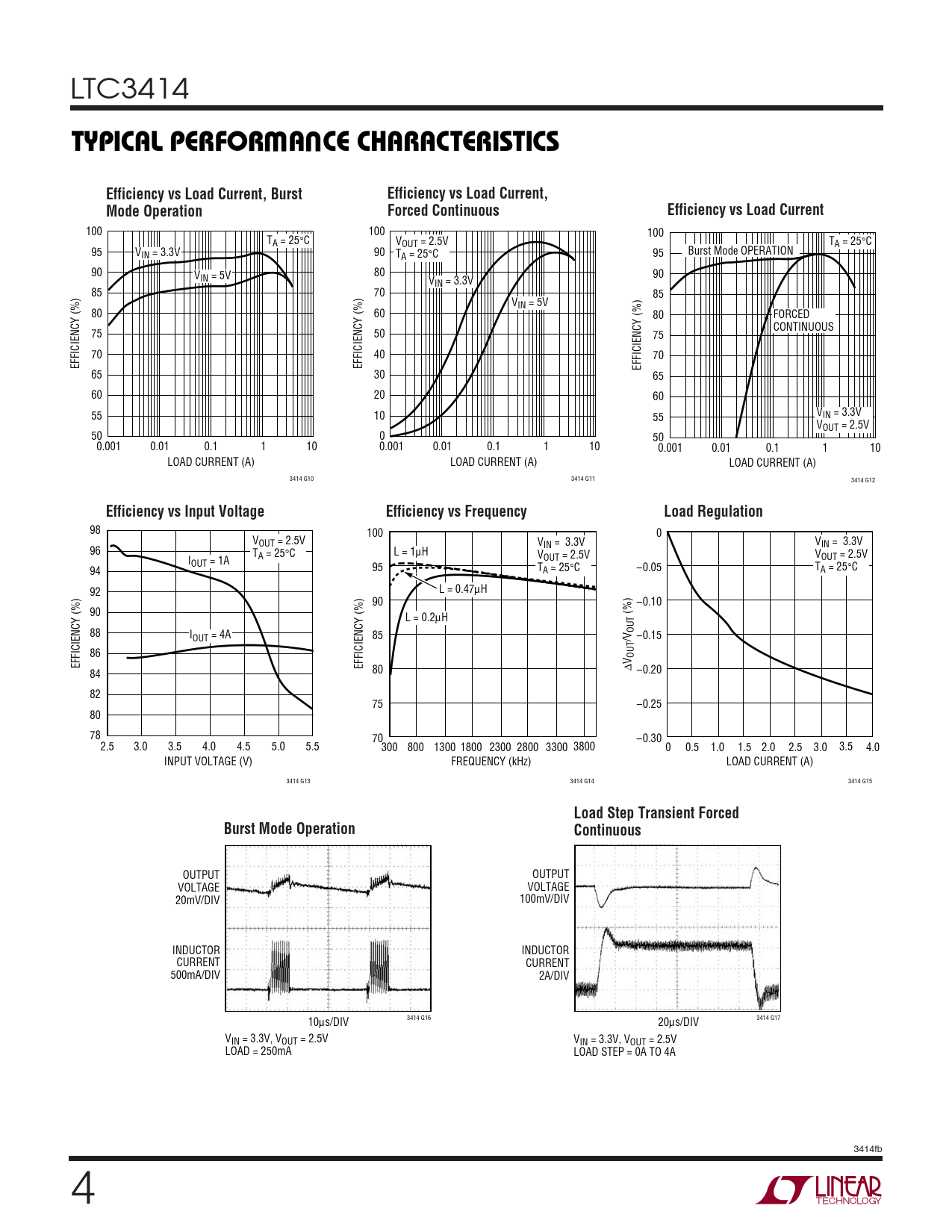 100 100 100 TA = 25°C VOUT = 2.5V TA = 25°C 95 V 90 Burst Mode OPERATION IN = 3.3V T 95 A = 25°C 90 80 V 90 IN = 5V VIN = 3.3V 85 70 85 VIN = 5V 80 60 80 FORCED CONTINUOUS 75 50 75 70 40 70 EFFICIENCY (%) EFFICIENCY (%) EFFICIENCY (%) 65 30 65 60 20 60 55 10 55 VIN = 3.3V VOUT = 2.5V 50 0 50 0.001 0.01 0.1 1 10 0.001 0.01 0.1 1 10 0.001 0.01 0.1 1 10 LOAD CURRENT (A) LOAD CURRENT (A) LOAD CURRENT (A) 3414 G10 3414 G11 3414 G12