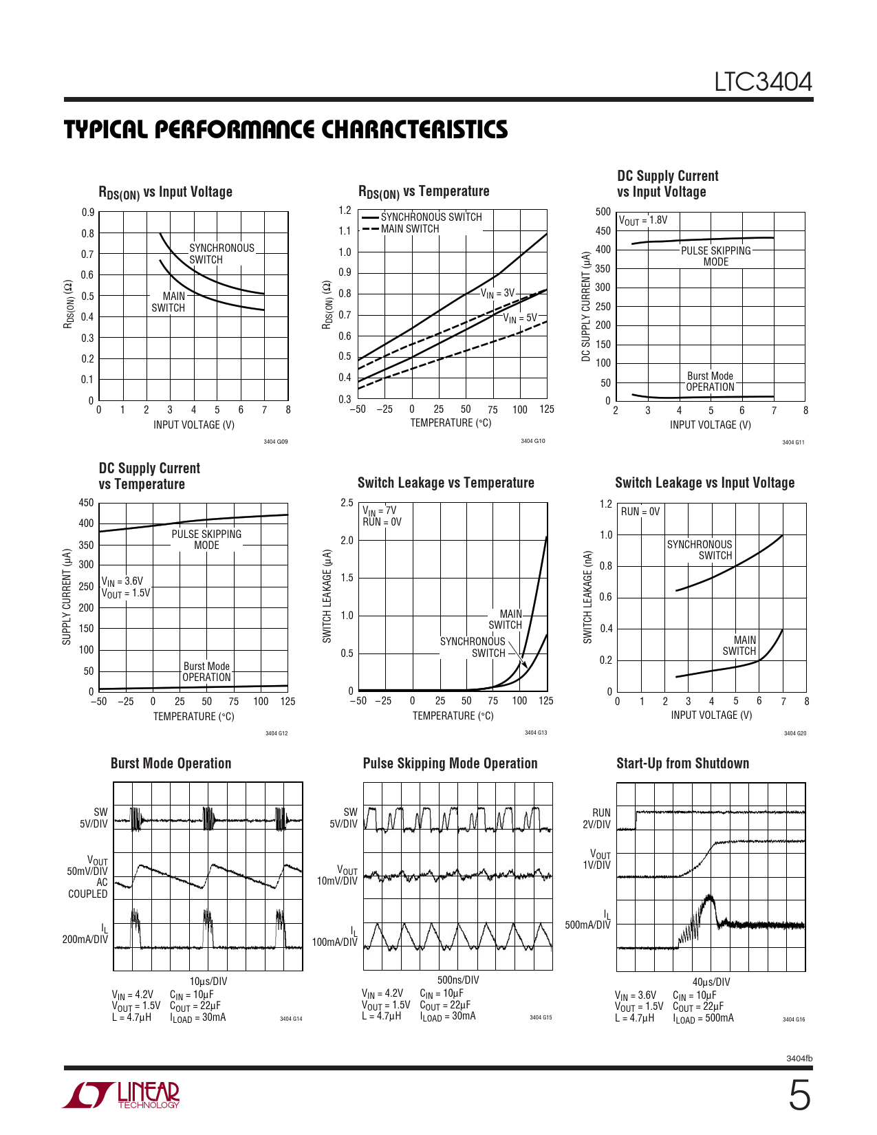 0.9 1.2 500 SYNCHRONOUS SWITCH VOUT = 1.8V 0.8 1.1 MAIN SWITCH 450 SYNCHRONOUS 400 0.7 1.0 PULSE SKIPPING SWITCH μA) MODE 0.9 350 ) 0.6 Ω ) Ω 300 ( 0.5 MAIN ( 0.8 VIN = 3V SWITCH 250 0.7 DS(ON) 0.4 DS(ON) VIN = 5V R R 200 0.3 0.6 150 0.2 0.5 DC SUPPLY CURRENT ( 100 0.1 0.4 Burst Mode 50 OPERATION 0 0.3 0 0 1 2 3 4 5 6 7 8 –50 –25 0 25 50 75 100 125 2 3 4 5 6 7 8 INPUT VOLTAGE (V) TEMPERATURE (°C) INPUT VOLTAGE (V) 3404 G09 3404 G10 3404 G11