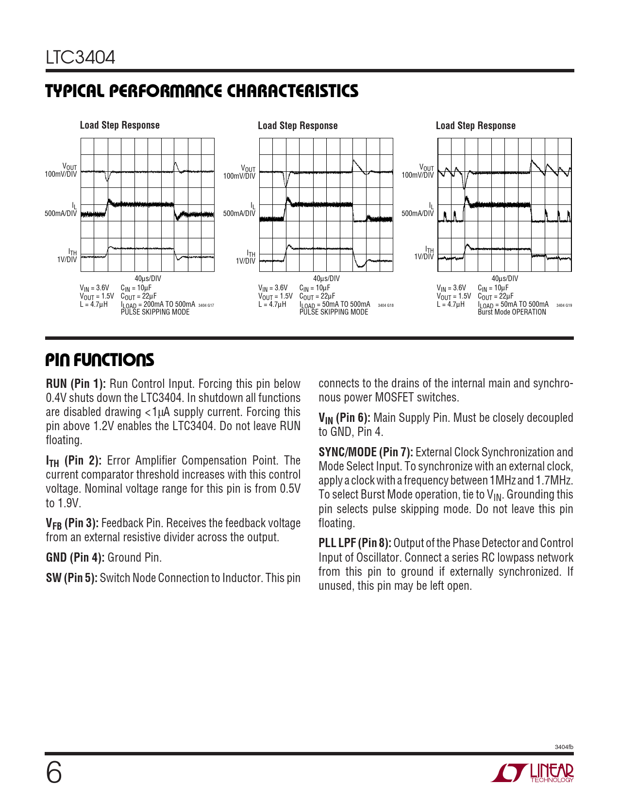 LTC3404 WUTYPICAL PERFOR A CE CHARACTERISTICSLoad Step ResponseLoad Step ResponseLoad Step Response VOUT VOUT VOUT 100mV/DIV 100mV/DIV 100mV/DIV IL IL IL 500mA/DIV 500mA/DIV 500mA/DIV I I TH I TH TH 1V/DIV 1V/DIV 1V/DIV 40μs/DIV 40μs/DIV 40μs/DIV VIN = 3.6V CIN = 10μF VIN = 3.6V CIN = 10μF VIN = 3.6V CIN = 10μF VOUT = 1.5V COUT = 22μF VOUT = 1.5V COUT = 22μF VOUT = 1.5V COUT = 22μF L = 4.7μH ILOAD = 200mA TO 500mA 3404 G17 L = 4.7μH ILOAD = 50mA TO 500mA 3404 G18 L = 4.7μH ILOAD = 50mA TO 500mA 3404 G19 PULSE SKIPPING MODE PULSE SKIPPING MODE Burst Mode OPERATION UUUPI FU CTIO SRUN (Pin 1): Run Control Input. Forcing this pin below connects to the drains of the internal main and synchro- 0.4V shuts down the LTC3404. In shutdown all functions nous power MOSFET switches. are disabled drawing < 1μA supply current. Forcing this V pin above 1.2V enables the LTC3404. Do not leave RUN IN (Pin 6): Main Supply Pin. Must be closely decoupled to GND, Pin 4. floating. SYNC/MODE (Pin 7): External Clock Synchronization and ITH (Pin 2): Error Amplifier Compensation Point. The Mode Select Input. To synchronize with an external clock, current comparator threshold increases with this control apply a clock with a frequency between 1MHz and 1.7MHz. voltage. Nominal voltage range for this pin is from 0.5V To select Burst Mode operation, tie to V to 1.9V. IN. Grounding this pin selects pulse skipping mode. Do not leave this pin VFB (Pin 3): Feedback Pin. Receives the feedback voltage floating. from an external resistive divider across the output. PLL LPF (Pin 8): Output of the Phase Detector and Control GND (Pin 4): Ground Pin. Input of Oscillator. Connect a series RC lowpass network from this pin to ground if externally synchronized. If SW (Pin 5): Switch Node Connection to Inductor. This pin unused, this pin may be left open. 3404fb 6