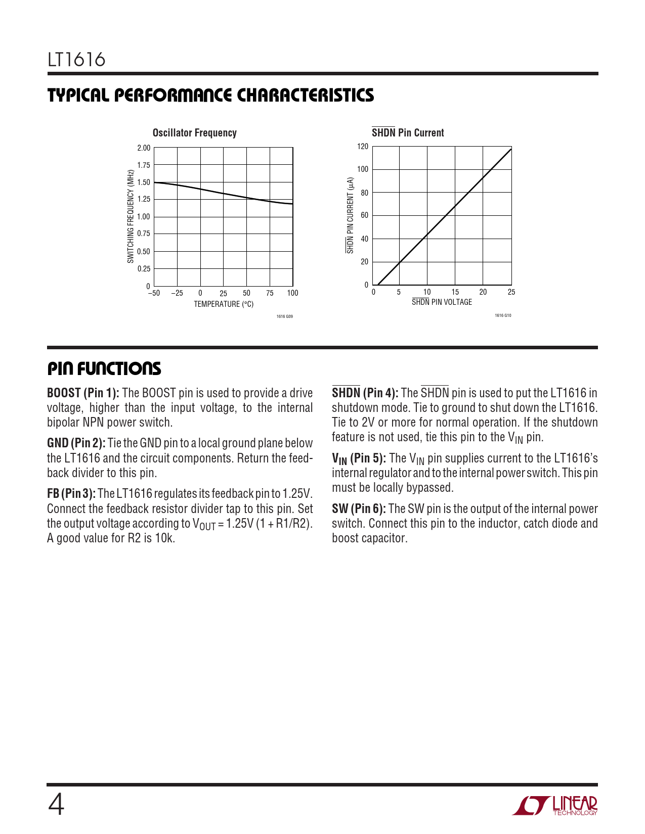 LT1616 WUTYPICAL PERFOR A CE CHARACTERISTICSOscillator FrequencySHDN Pin Current 2.00 120 1.75 100 1.50 µA) 80 1.25 1.00 60 0.75 40 0.50 SHDN PIN CURRENT ( SWITCHING FREQUENCY (MHz) 20 0.25 0 0 –50 –25 0 25 50 75 100 0 5 10 15 20 25 TEMPERATURE (°C) SHDN PIN VOLTAGE 1616 G09 1616 G10 UUUPI FU CTIO SBOOST (Pin 1): The BOOST pin is used to provide a drive SHDN (Pin 4): The SHDN pin is used to put the LT1616 in voltage, higher than the input voltage, to the internal shutdown mode. Tie to ground to shut down the LT1616. bipolar NPN power switch. Tie to 2V or more for normal operation. If the shutdown feature is not used, tie this pin to the V GND (Pin 2): Tie the GND pin to a local ground plane below IN pin. the LT1616 and the circuit components. Return the feed- VIN (Pin 5): The VIN pin supplies current to the LT1616’s back divider to this pin. internal regulator and to the internal power switch. This pin must be locally bypassed. FB (Pin 3): The LT1616 regulates its feedback pin to 1.25V. Connect the feedback resistor divider tap to this pin. Set SW (Pin 6): The SW pin is the output of the internal power the output voltage according to VOUT = 1.25V (1 + R1/R2). switch. Connect this pin to the inductor, catch diode and A good value for R2 is 10k. boost capacitor. 4