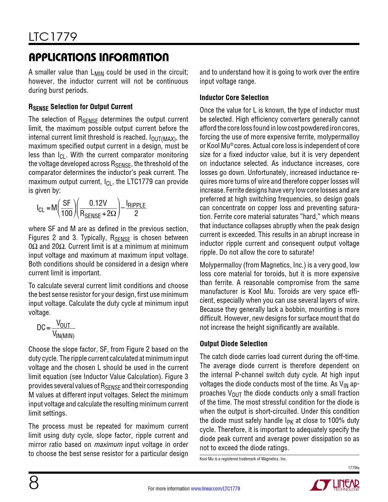 LTC1779 applicaTions inForMaTion A smaller value than LMIN could be used in the circuit; and to understand how it is going to work over the entire however, the inductor current will not be continuous input voltage range. during burst periods. Inductor Core SelectionRSENSE Selection for Output Current Once the value for L is known, the type of inductor must The selection of RSENSE determines the output current be selected. High efficiency converters generally cannot limit, the maximum possible output current before the afford the core loss found in low cost powdered iron cores, internal current limit threshold is reached. IOUT(MAX), the forcing the use of more expensive ferrite, molypermalloy maximum specified output current in a design, must be or Kool Mu® cores. Actual core loss is independent of core less than ICL. With the current comparator monitoring size for a fixed inductor value, but it is very dependent the voltage developed across RSENSE, the threshold of the on inductance selected. As inductance increases, core comparator determines the inductor’s peak current. The losses go down. Unfortunately, increased inductance re- maximum output current, ICL, the LTC1779 can provide quires more turns of wire and therefore copper losses will is given by: increase. Ferrite designs have very low core losses and are ⎛ ⎞ preferred at high switching frequencies, so design goals I ⎛ ⎞ 0.12V CL =M SF ⎜ ⎟⎜ ⎟– IRIPPLE can concentrate on copper loss and preventing satura- ⎝100 ⎠⎝RSENSE +2Ω⎠ 2 tion. Ferrite core material saturates “hard,” which means where SF and M are as defined in the previous section, that inductance collapses abruptly when the peak design Figures 2 and 3. Typically, R current is exceeded. This results in an abrupt increase in SENSE is chosen between 0Ω and 20Ω. Current limit is at a minimum at minimum inductor ripple current and consequent output voltage input voltage and maximum at maximum input voltage. ripple. Do not allow the core to saturate! Both conditions should be considered in a design where Molypermalloy (from Magnetics, Inc.) is a very good, low current limit is important. loss core material for toroids, but it is more expensive To calculate several current limit conditions and choose than ferrite. A reasonable compromise from the same the best sense resistor for your design, first use minimum manufacturer is Kool Mu. Toroids are very space effi- input voltage. Calculate the duty cycle at minimum input cient, especially when you can use several layers of wire. voltage. Because they generally lack a bobbin, mounting is more difficult. However, new designs for surface mount that do DC V = OUT not increase the height significantly are available. VIN(MIN) Output Diode Selection Choose the slope factor, SF, from Figure 2 based on the duty cycle. The ripple current calculated at minimum input The catch diode carries load current during the off-time. voltage and the chosen L should be used in the current The average diode current is therefore dependent on limit equation (see Inductor Value Calculation). Figure 3 the internal P-channel switch duty cycle. At high input provides several values of R voltages the diode conducts most of the time. As V SENSE and their corresponding IN ap- M values at different input voltages. Select the minimum proaches VOUT the diode conducts only a small fraction input voltage and calculate the resulting minimum current of the time. The most stressful condition for the diode is limit settings. when the output is short-circuited. Under this condition the diode must safely handle I The process must be repeated for maximum current PK at close to 100% duty cycle. Therefore, it is important to adequately specify the limit using duty cycle, slope factor, ripple current and diode peak current and average power dissipation so as mirror ratio based on maximum input voltage in order not to exceed the diode ratings. to choose the best sense resistor for a particular design Kool Mu is a registered trademark of Magnetics, Inc. 1779fa 8 For more information www.linear.com/LTC1779