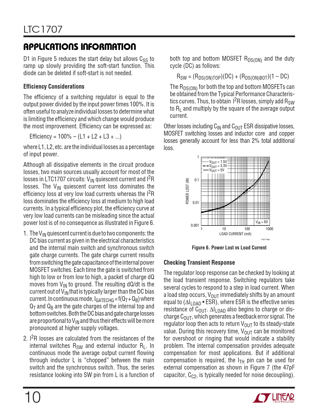 LTC1707 UUWUAPPLICATIO S I FOR ATIO D1 in Figure 5 reduces the start delay but allows CSS to both top and bottom MOSFET RDS(ON) and the duty ramp up slowly providing the soft-start function. This cycle (DC) as follows: diode can be deleted if soft-start is not needed. RSW = (RDS(ON)TOP)(DC) + (RDS(ON)BOT)(1 – DC) Efficiency Considerations The RDS(ON) for both the top and bottom MOSFETs can be obtained from the Typical Performance Characteris- The efficiency of a switching regulator is equal to the tics curves. Thus, to obtain I2R losses, simply add R output power divided by the input power times 100%. It is SW to R often useful to analyze individual losses to determine what L and multiply by the square of the average output current. is limiting the efficiency and which change would produce the most improvement. Efficiency can be expressed as: Other losses including CIN and COUT ESR dissipative losses, MOSFET switching losses and inductor core and copper Efficiency = 100% – (L1 + L2 + L3 + ...) losses generally account for less than 2% total additional where L1, L2, etc. are the individual losses as a percentage loss. of input power. 1 V Although all dissipative elements in the circuit produce OUT = 1.5V VOUT = 3.3V losses, two main sources usually account for most of the VOUT = 5V losses in LTC1707 circuits: VIN quiescent current and I2R 0.1 losses. The VIN quiescent current loss dominates the efficiency loss at very low load currents whereas the I2R loss dominates the efficiency loss at medium to high load POWER LOST (W) 0.01 currents. In a typical efficiency plot, the efficiency curve at very low load currents can be misleading since the actual power lost is of no consequence as illustrated in Figure 6. VIN = 6V 0.001 1 10 100 1000 1. The VIN quiescent current is due to two components: the LOAD CURRENT (mA) DC bias current as given in the electrical characteristics 1707 F06 and the internal main switch and synchronous switch Figure 6. Power Lost vs Load Current gate charge currents. The gate charge current results from switching the gate capacitance of the internal power Checking Transient Response MOSFET switches. Each time the gate is switched from The regulator loop response can be checked by looking at high to low or from low to high, a packet of charge dQ the load transient response. Switching regulators take moves from VIN to ground. The resulting dQ/dt is the several cycles to respond to a step in load current. When current out of VIN that is typically larger than the DC bias a load step occurs, V current. In continuous mode, I OUT immediately shifts by an amount GATECHG = f(QT + QB) where equal to (∆I Q LOAD • ESR), where ESR is the effective series T and QB are the gate charges of the internal top and resistance of C bottom switches. Both the DC bias and gate charge losses OUT. ∆ILOAD also begins to charge or dis- charge C are proportional to V OUT, which generates a feedback error signal. The IN and thus their effects will be more regulator loop then acts to return V pronounced at higher supply voltages. OUT to its steady-state value. During this recovery time, VOUT can be monitored 2. I2R losses are calculated from the resistances of the for overshoot or ringing that would indicate a stability internal switches RSW and external inductor RL. In problem. The internal compensation provides adequate continuous mode the average output current flowing compensation for most applications. But if additional through inductor L is “chopped” between the main compensation is required, the ITH pin can be used for switch and the synchronous switch. Thus, the series external compensation as shown in Figure 7 (the 47pF resistance looking into SW pin from L is a function of capacitor, CC2, is typically needed for noise decoupling). 10
