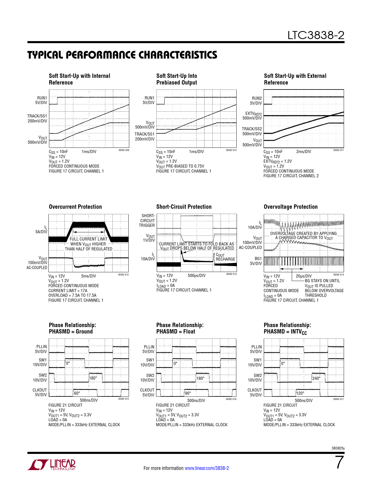 RUN1 RUN1 RUN2 5V/DIV 5V/DIV 5V/DIV EXTV TRACK/SS1 REF2 500mV/DIV 200mV/DIV VOUT 500mV/DIV TRACK/SS2 TRACK/SS1 500mV/DIV VOUT 200mV/DIV 500mV/DIV VOUT 500mV/DIV 1ms/DIV 38382 G09 CSS = 10nF 1ms/DIV 38382 G10 CSS = 10nF 2ms/DIV 38382 G11 CSS = 10nF VIN = 12V VIN = 12V VIN = 12V VOUT = 1.2V VOUT = 1.2V EXTVREF2 = 1.2V FORCED CONTINUOUS MODE VOUT PRE-BIASED TO 0.75V VOUT = 1.2V FIGURE 17 CIRCUIT, CHANNEL 1 FIGURE 17 CIRCUIT, CHANNEL 1 FORCED CONTINUOUS MODE FIGURE 17 CIRCUIT, CHANNEL 2