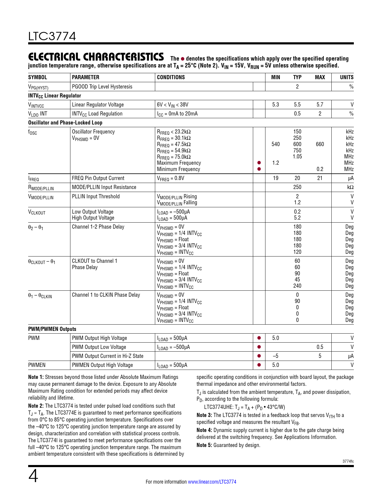 Guaranteed by design. ambient temperature consistent with these specifications is determined by 3774fc 4 For more information www.linear.com/LTC3774 Document Outline Features Applications Description Typical Application Absolute Maximum Ratings Pin Configuration Order Information Electrical Characteristics Typical Performance Characteristics Pin Functions Functional Block Diagram Operation Applications Information Typical Applications Package Description Typical Application Related Parts