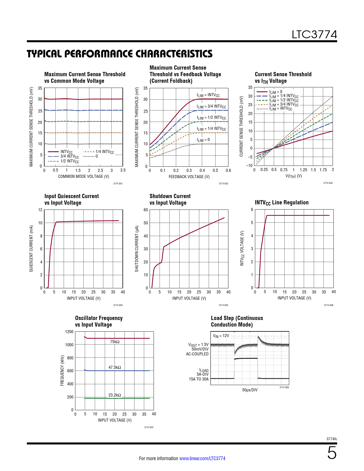 35 35 35 I I LIM = 0 LIM = INTVCC 30 I 30 30 LIM = 1/4 INTVCC ILIM = 1/2 INTVCC I 25 I LIM = 3/4 INTVCC LIM = 3/4 INTVCC I 25 25 LIM = INTVCC 20 ILIM = 1/2 INTVCC 20 20 15 ILIM = 1/4 INTVCC 15 15 10 ILIM = 0 5 10 10 0 INTV 1/4 INTV 5 CC CC 3/4 INTV 5 CC 0 CURRENT SENSE THRESHOLD (mV) –5 1/2 INTVCC MAXIMUM CURRENT SENSE THRESHOLD (mV) 0 MAXIMUM CURRENT SENSE THRESHOLD (mV) 0 –10 0 0.5 1 1.5 2 2.5 3 3.5 0 0.1 0.2 0.3 0.4 0.5 0.6 0 0.25 0.5 0.75 1 1.25 1.5 1.75 2 COMMON MODE VOLTAGE (V) FEEDBACK VOLTAGE (V) V(ITH) (V) 3774 G01 3774 G02 3774 G03