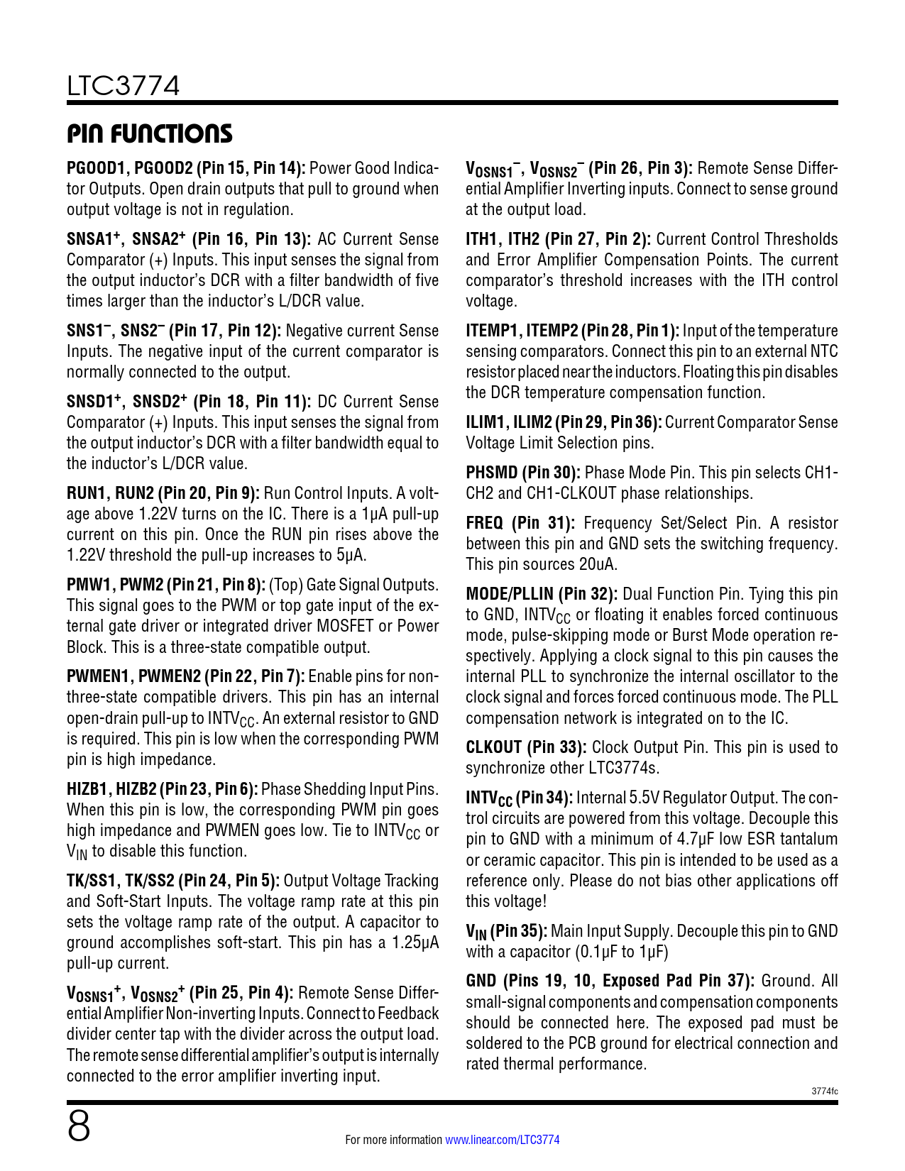 Seiten / Seite38 / 8 — PIN FUNCTIONS PGOOD1, PGOOD2 (Pin 15, Pin 14):. OSNS1 , VOSNS2 (Pin 26, …